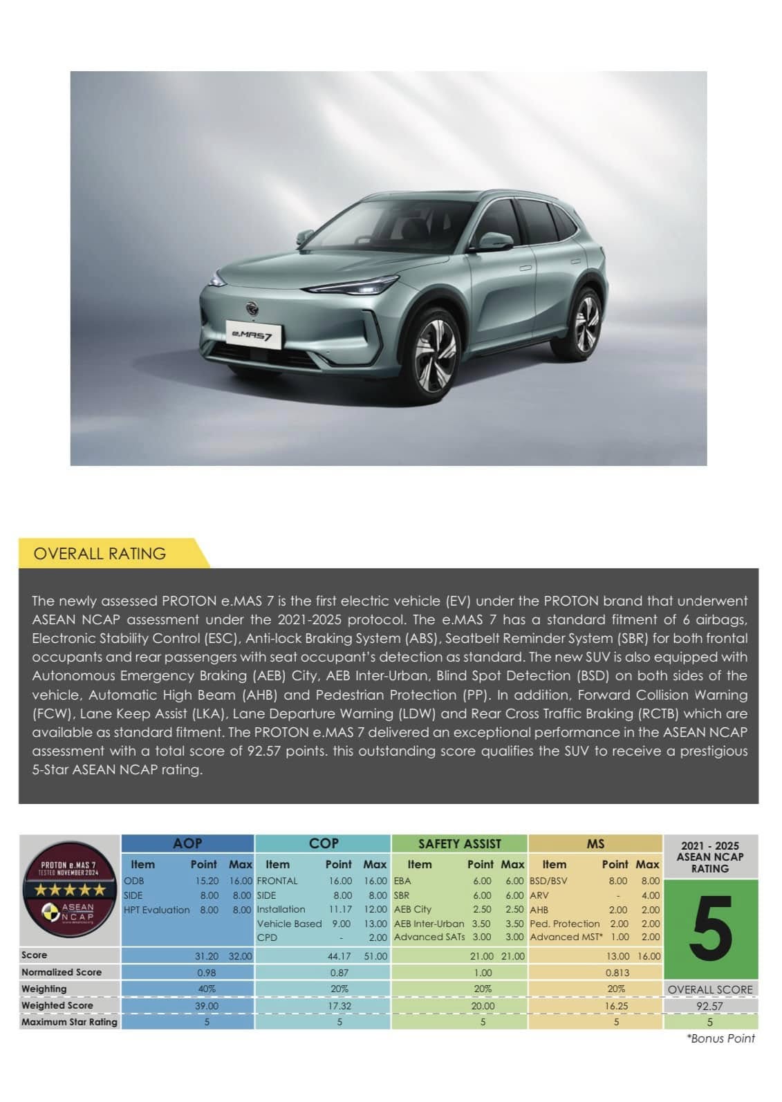 PROTON e.MAS 7 ซึ่งเป็นรถยนต์ไฟฟ้ารุ่นแรกภายใต้แบรนด์ PROTON ที่ผ่านการประเมินของ ASEAN NCAP ภายใต้เกณฑ์มาตรฐานปี 2021-2025 รถรุ่นนี้มาพร้อมกับอุปกรณ์มาตรฐานที่ประกอบด้วยถุงลมนิรภัย 6 ตำแหน่ง, ระบบควบคุมเสถียรภาพการทรงตัว (ESC), ระบบป้องกันล้อล็อกขณะเบรก (ABS), และระบบเตือนคาดเข็มขัดนิรภัย (SBR) สำหรับผู้โดยสารด้านหน้าและด้านหลัง พร้อมระบบตรวจจับการมีผู้โดยสาร