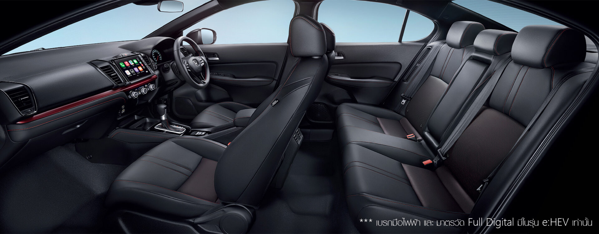 - เบาะหนังแท้และหนังสังเคราะห์สีดำตกแต่งด้วยด้ายสีแดง