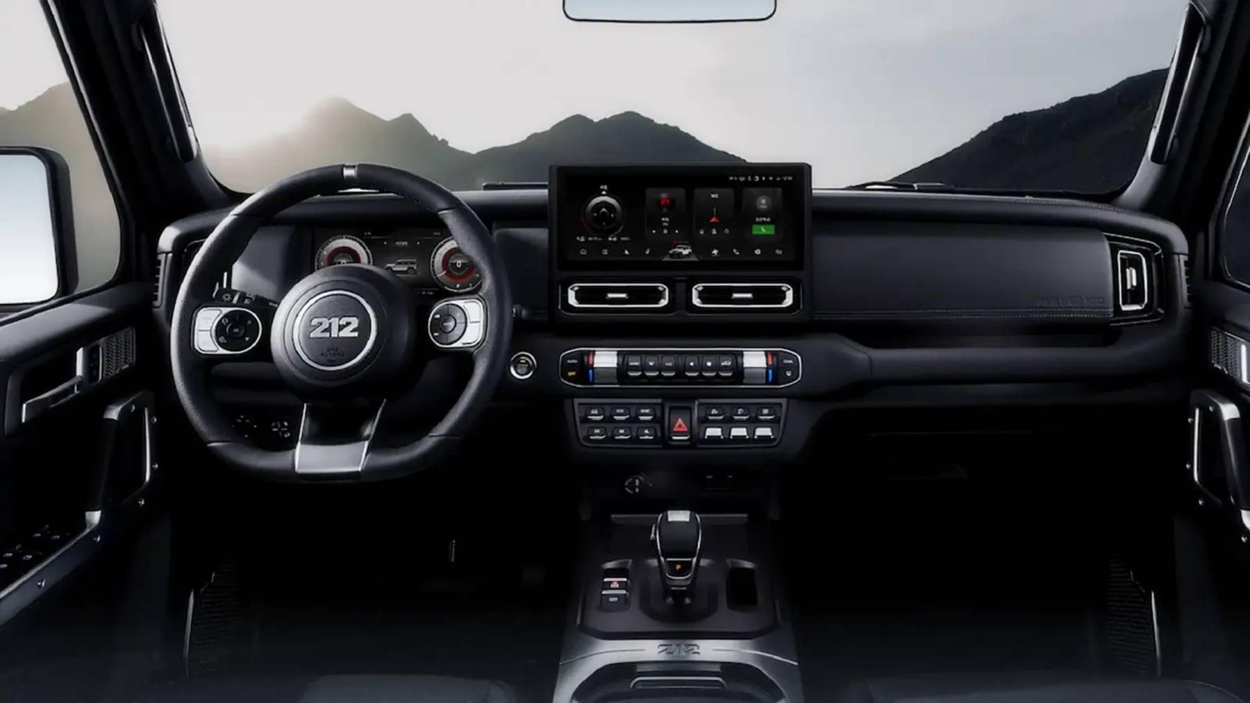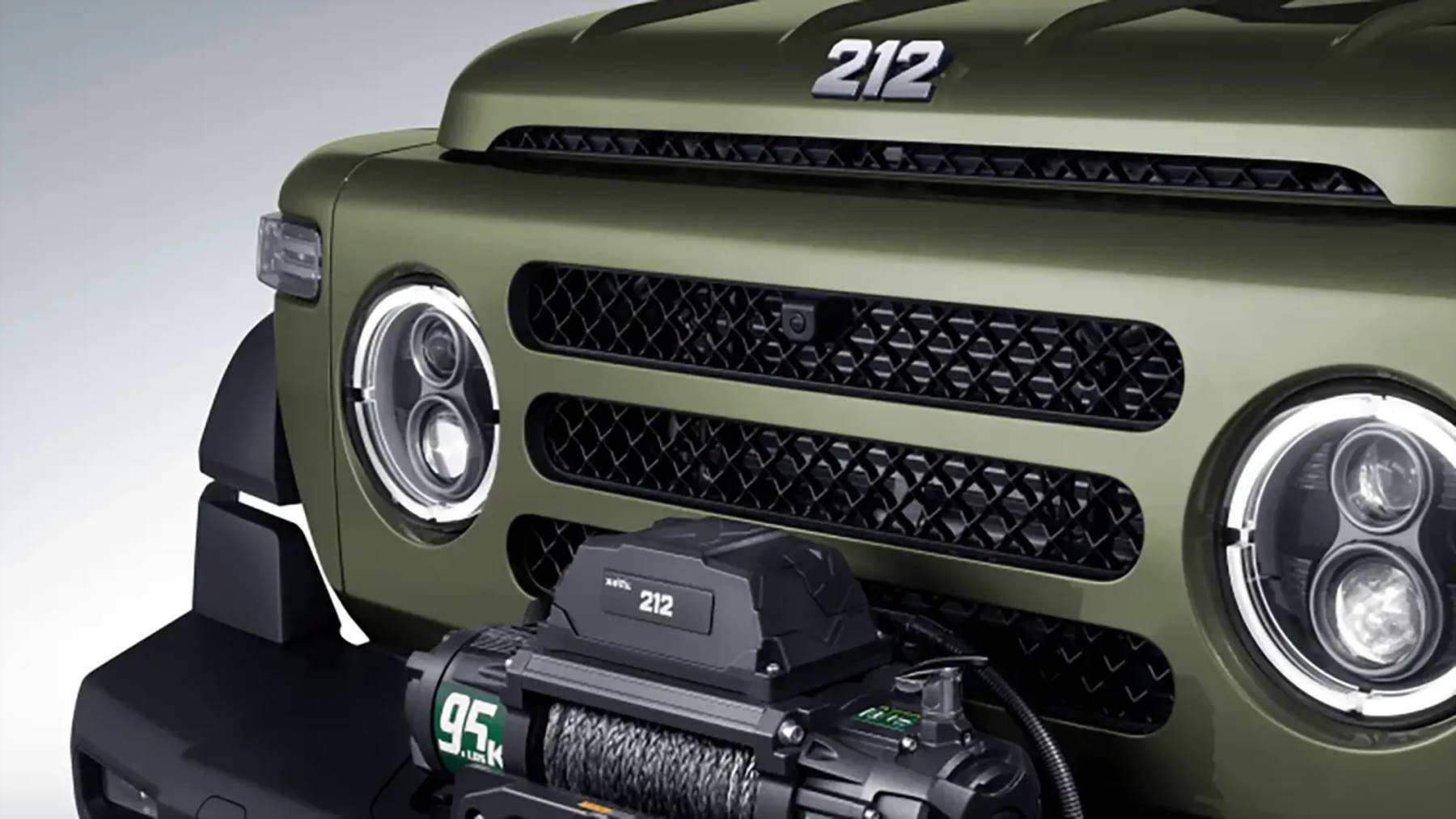 - การออกแบบภายนอก: คงเอกลักษณ์คลาสสิกของ 212: ฝากระโปรงแบบ Clamshell, ไฟหน้า LED ทรงกลมแยกส่วนพร้อมเลนส์, กระจังหน้าสามส่วน, กระจกหน้าและที่ปัดน้ำฝนแบบย้อนยุค มีเส้นสายตัวถังที่แข็งแรงทนทาน, กันชนหนา, และซุ้มล้อพลาสติกสีดำขนาดใหญ่ มียางอะไหล่ขนาดเต็มติดตั้งด้านท้ายรถ