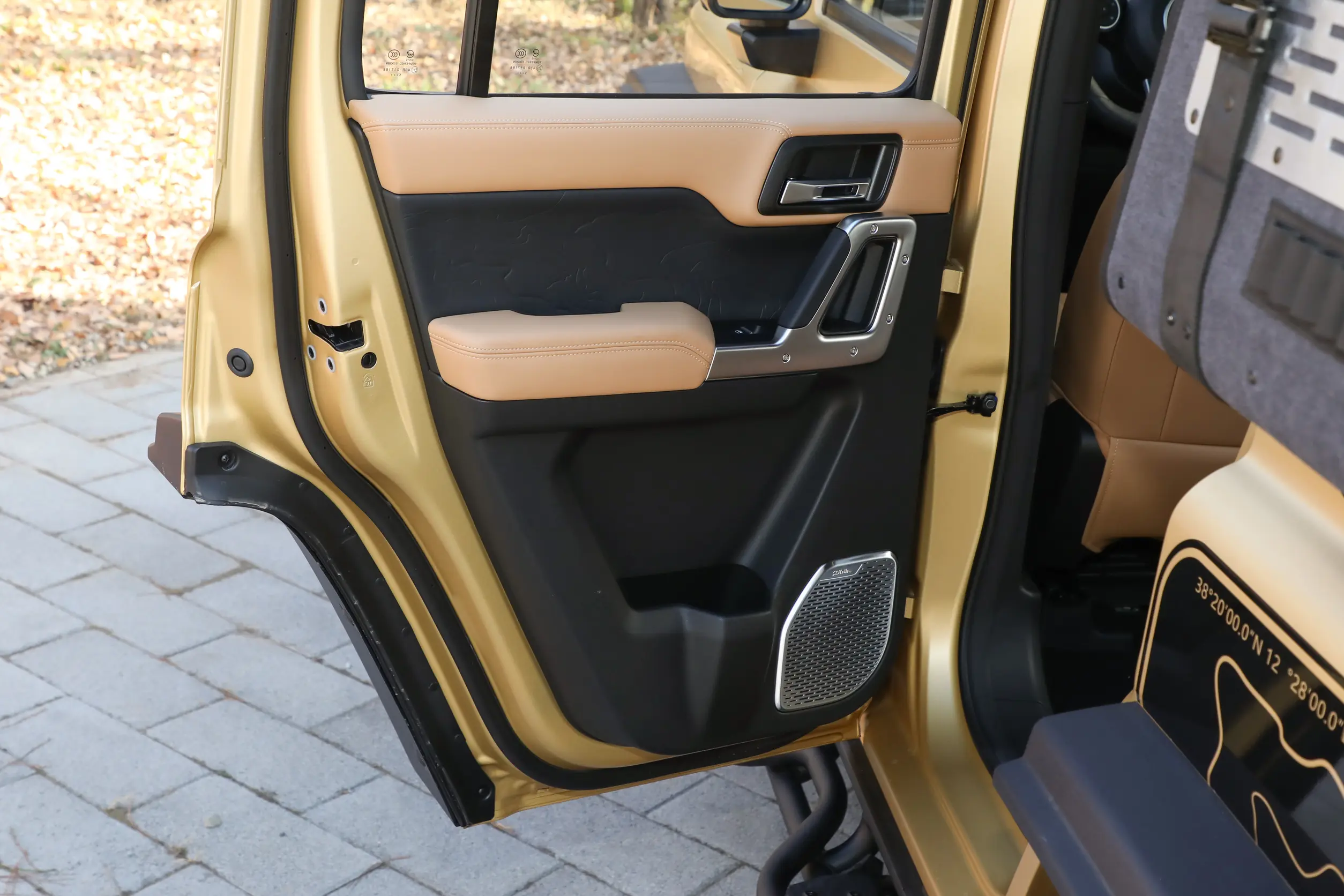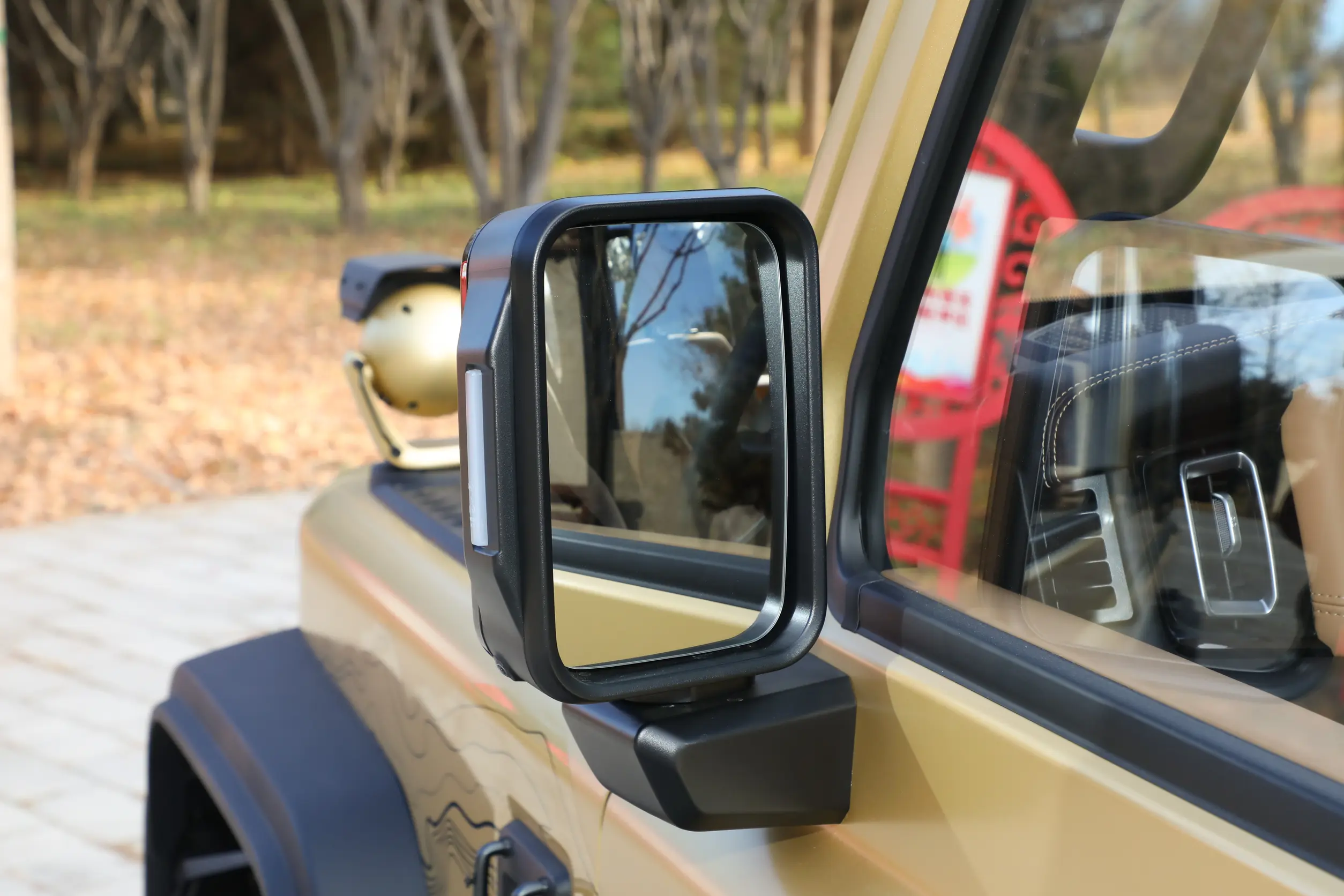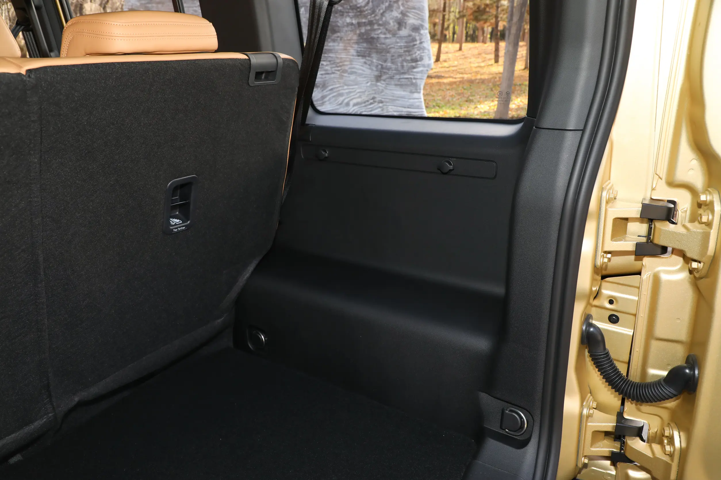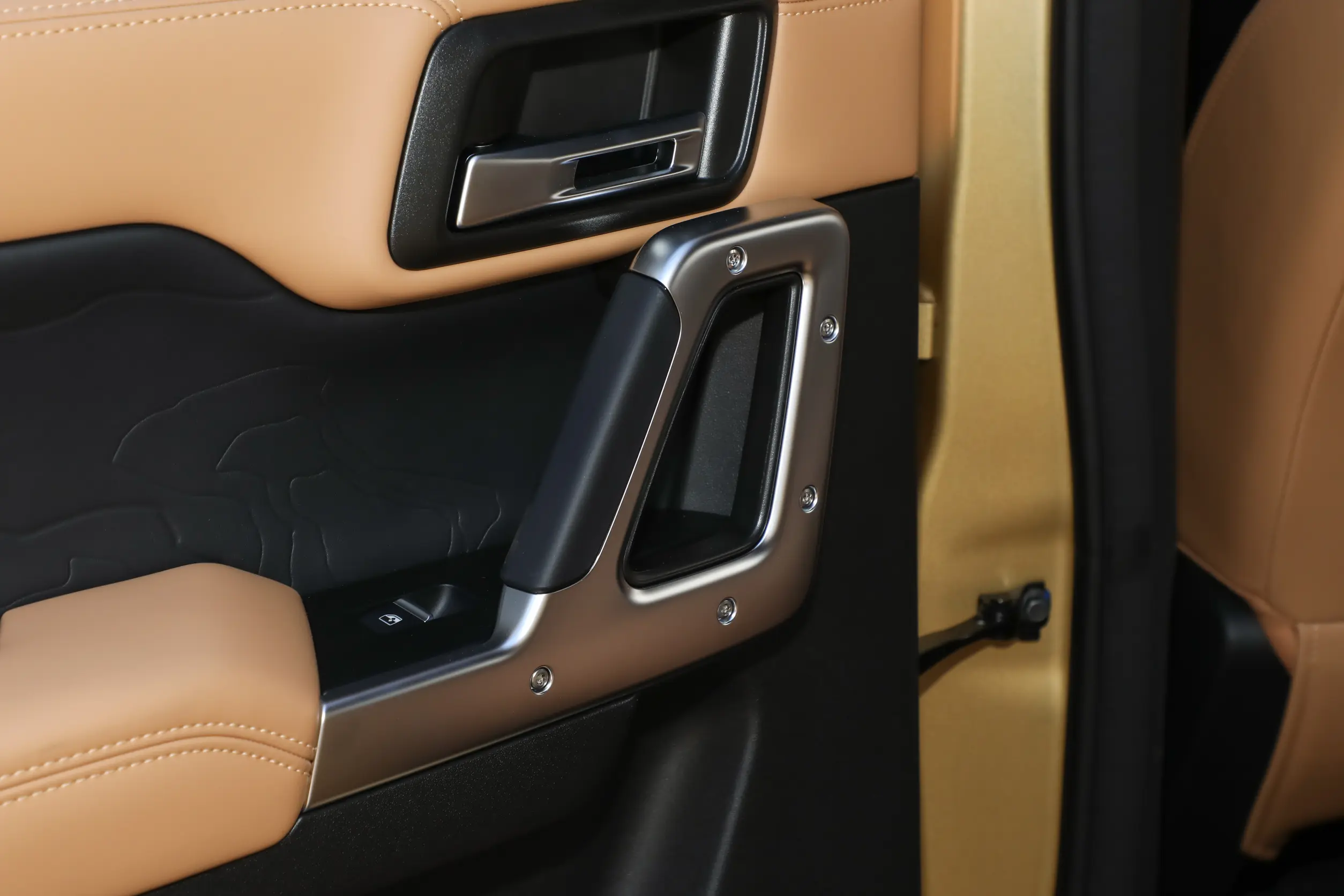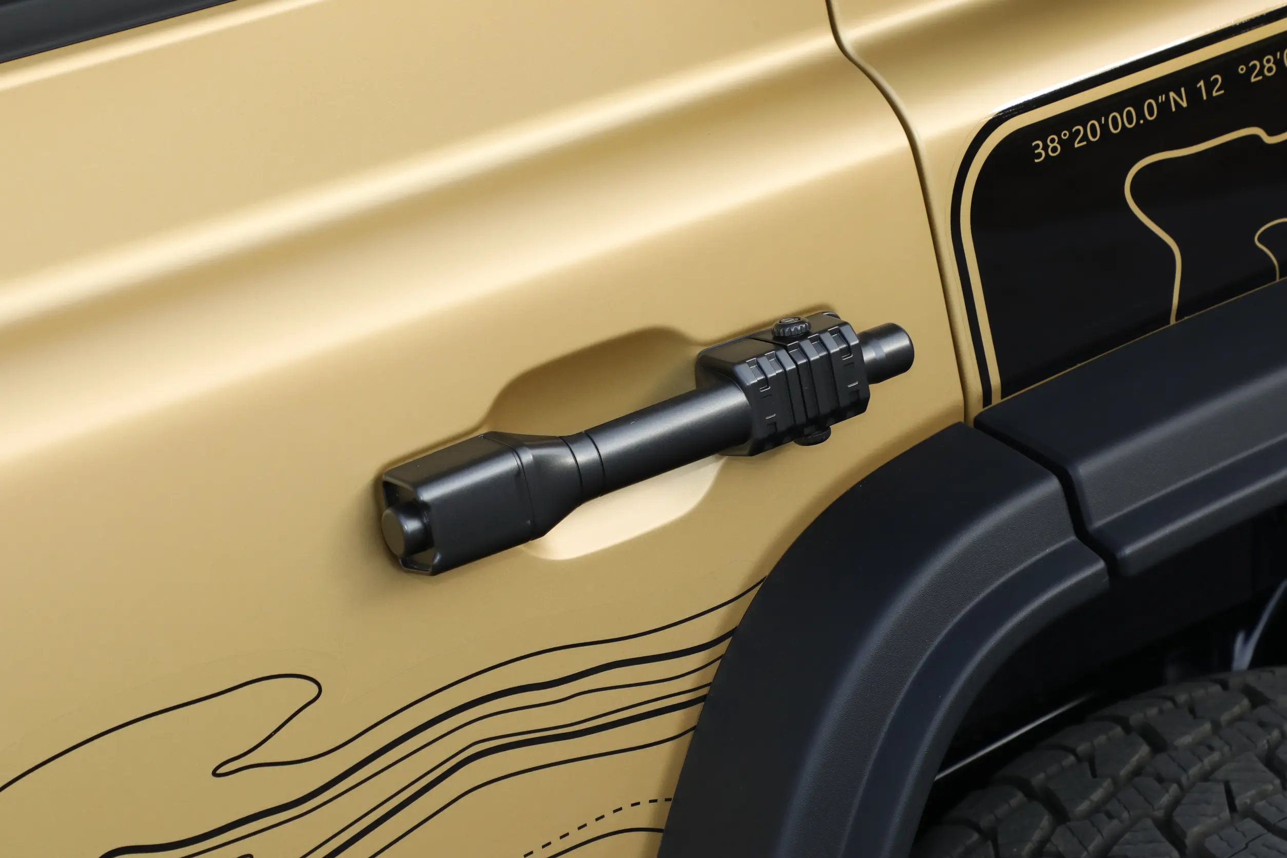 บริเวณด้านข้างตัวรถมาพร้อมท่อหายใจสำหรับลุยน้ำ (Snorkel) ช่องดักอากาศบนฝากระโปรงหน้า และบันไดข้างโลหะ เสริมด้วยโครงสร้างกันกระแทกแบบแข็งบริเวณด้านล่างประตู ผสานกับการออกแบบยางอะไหล่แบบแขวนภายนอกที่ซ่อนไว้อย่างแนบเนียน ช่วยเพิ่มทั้งความดุดันทางสายตาและความแข็งแกร่งในการใช้งานบนเส้นทางสมบุกสมบัน