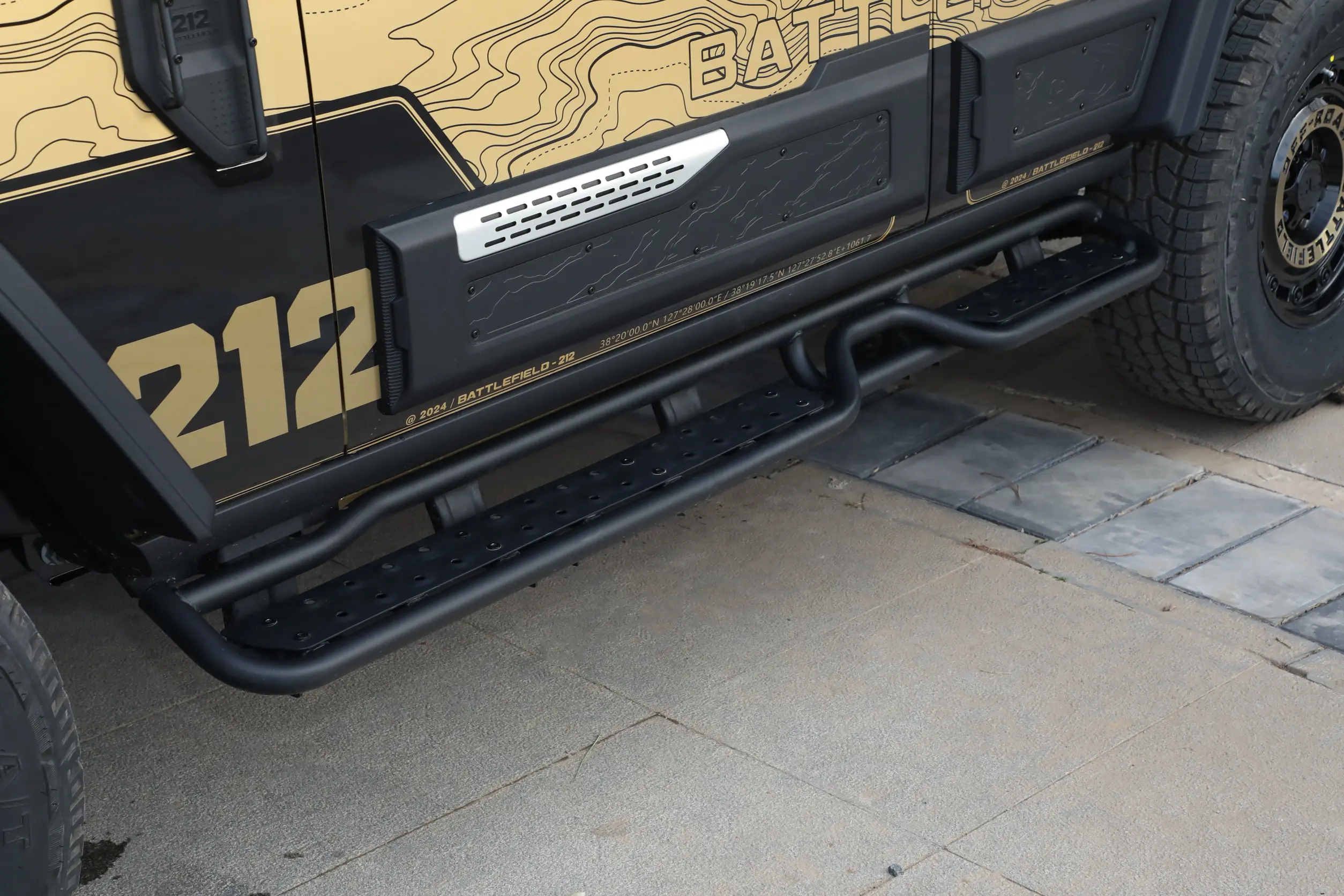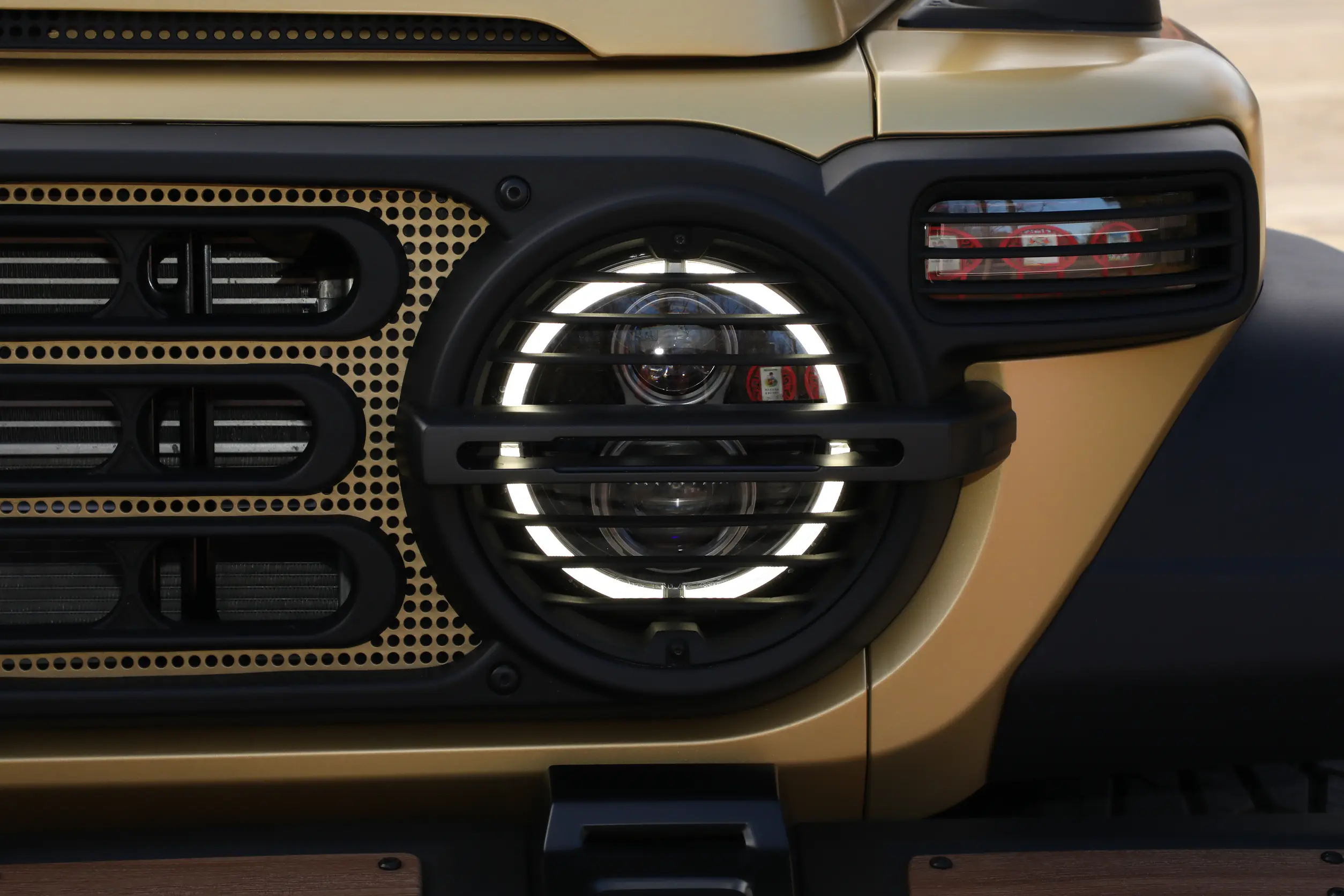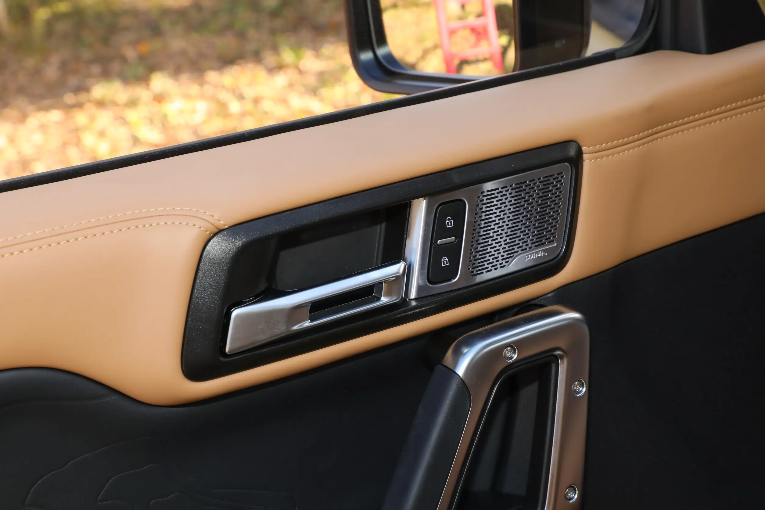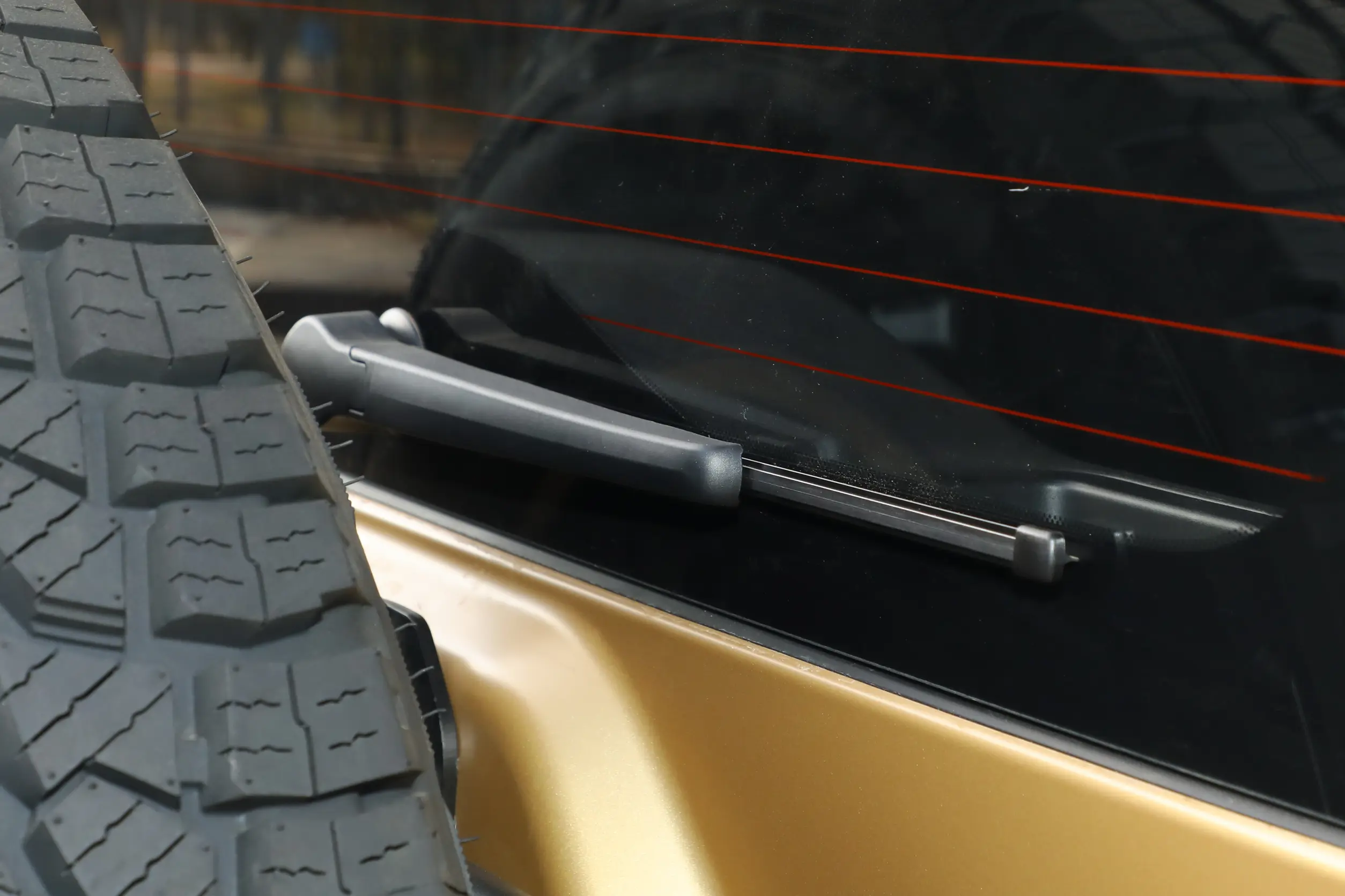 บริเวณด้านข้างตัวรถมาพร้อมท่อหายใจสำหรับลุยน้ำ (Snorkel) ช่องดักอากาศบนฝากระโปรงหน้า และบันไดข้างโลหะ เสริมด้วยโครงสร้างกันกระแทกแบบแข็งบริเวณด้านล่างประตู ผสานกับการออกแบบยางอะไหล่แบบแขวนภายนอกที่ซ่อนไว้อย่างแนบเนียน ช่วยเพิ่มทั้งความดุดันทางสายตาและความแข็งแกร่งในการใช้งานบนเส้นทางสมบุกสมบัน