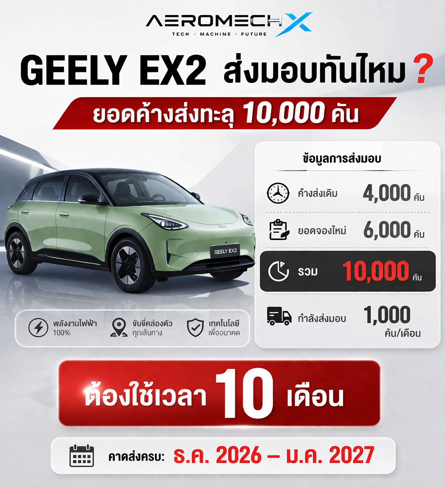 GEELY EX2 รถไฟฟ้า 100% รุ่นใหม่ บุกตลาดไทยอย่างเป็นทางการในงาน Motor Expo 2025 วันที่ 28 พฤศจิกายน 2568 โดย GEELY Thailand นำเข้า แบบ CBU จากจีน และมีให้เลือกทั้งหมด 2 รุ่นย่อย ได้แก่ EX2 PRO และ EX2 MAX