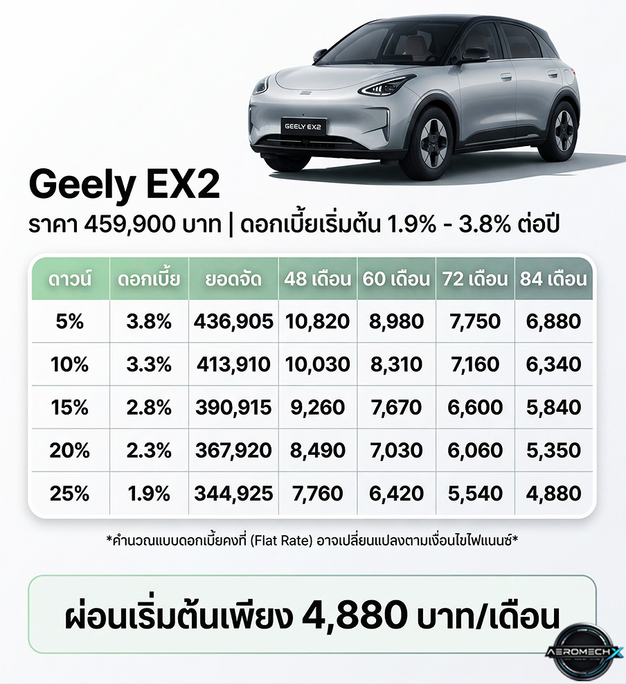GEELY EX2 395 กม./ชาร์จ NEDC ราคา 429,990 – 459,990 บาท 2026 ในไทย ตารางผ่อนดาวน์