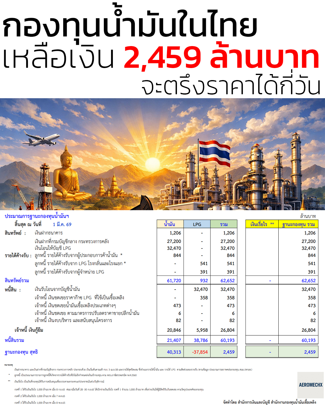 ข้อมูลอัพเดท 1 มีนาคม 2569 เกี่ยวกับสุขภาพการเงินกองทุนน้ำมันเชื้อเพลิงของไทย กลับมา “เป็นบวก” ได้แค่ 2,459 ล้านบาท หลังจากที่ติดลบตัวแดงมานานหลายปี พูดง่ายๆ คือเพิ่งเริ่มมีเงินเก็บในกระเป๋านิดเดียวเองครับ
