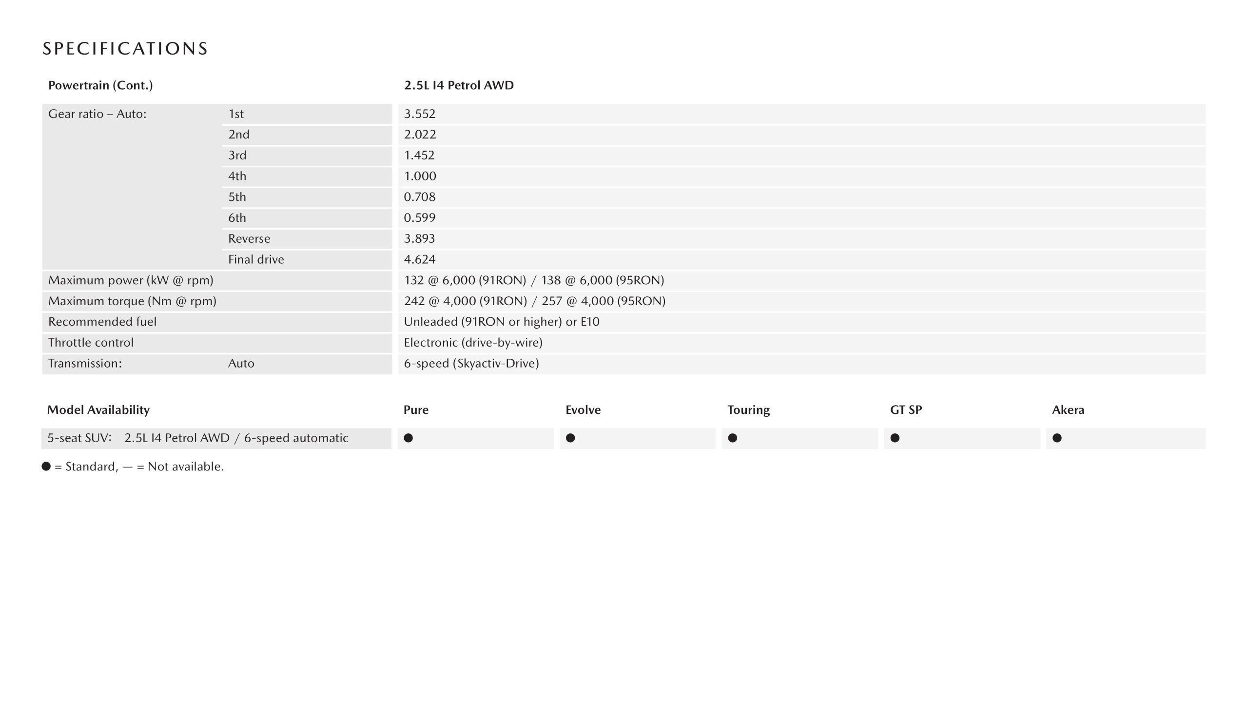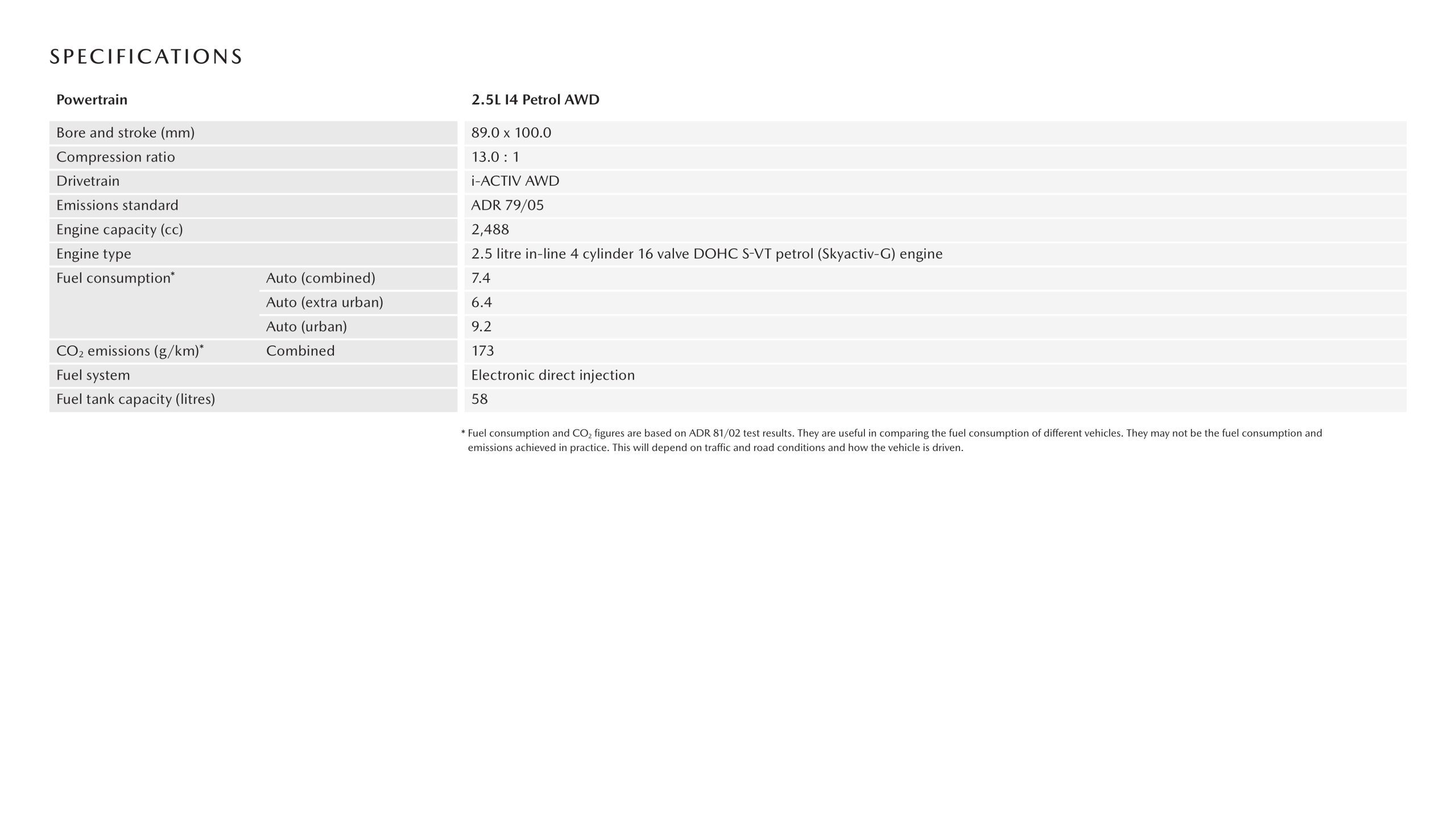 เครื่องยนต์ทำงานควบคู่กับเกียร์อัตโนมัติ 6 สปีด (Skyactiv-Drive) ส่งกำลังผ่านระบบขับเคลื่อนสี่ล้อ i-Activ AWD โดยมีตัวเลขอัตราสิ้นเปลืองน้ำมันที่แปลงเป็นหน่วยกิโลเมตรต่อลิตร ดังนี้: