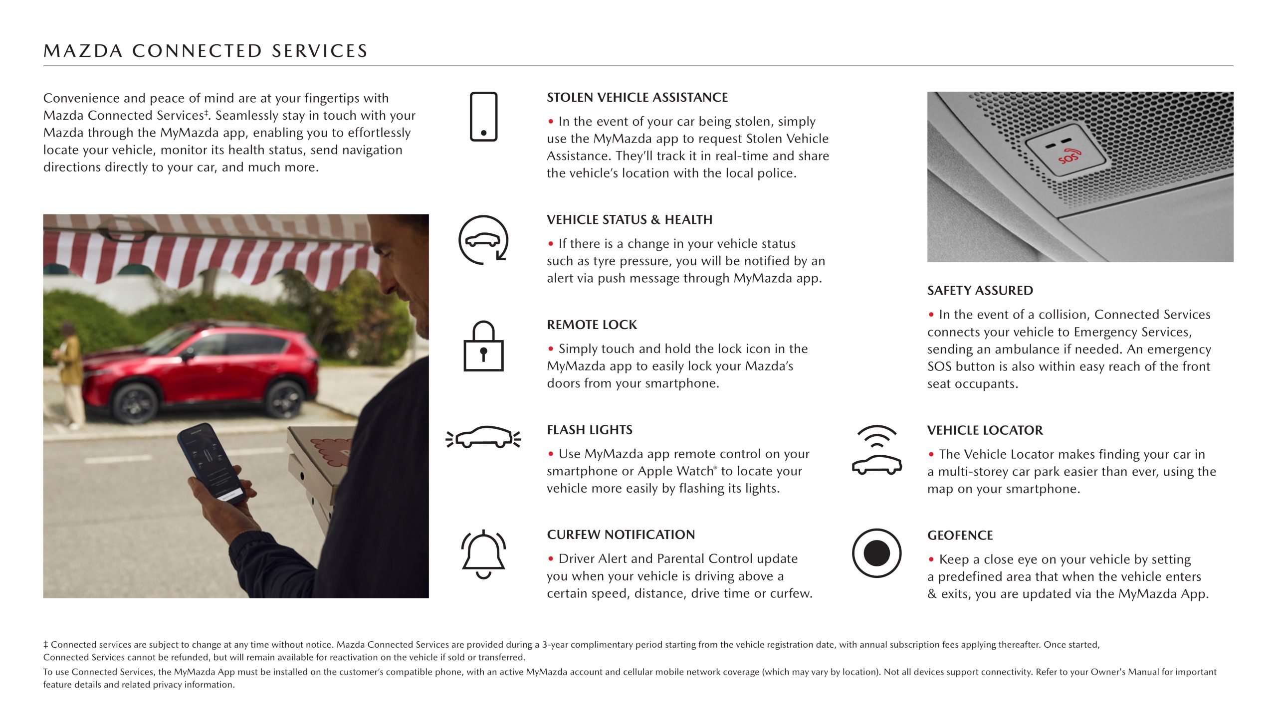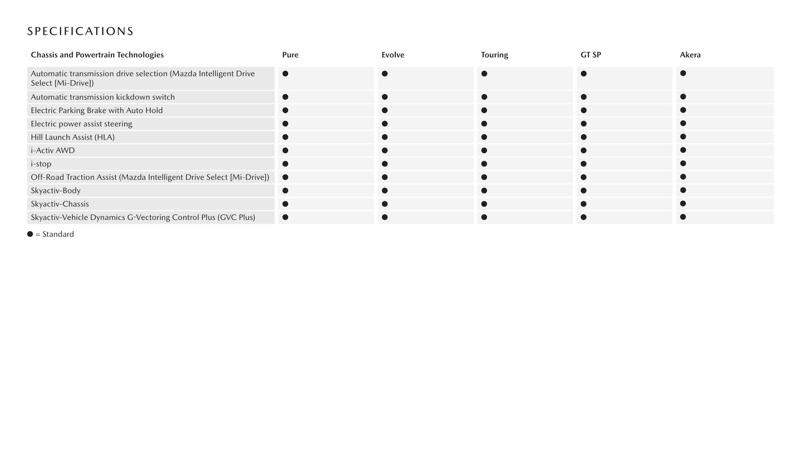- G-Vectoring Control Plus (GVC Plus): เทคโนโลยีเฉพาะของ Mazda ที่ช่วยปรับแรงบิดเครื่องยนต์และใช้เบรกเพื่อช่วยให้การเข้าโค้งนุ่มนวลและทรงตัวได้ดีเยี่ยม