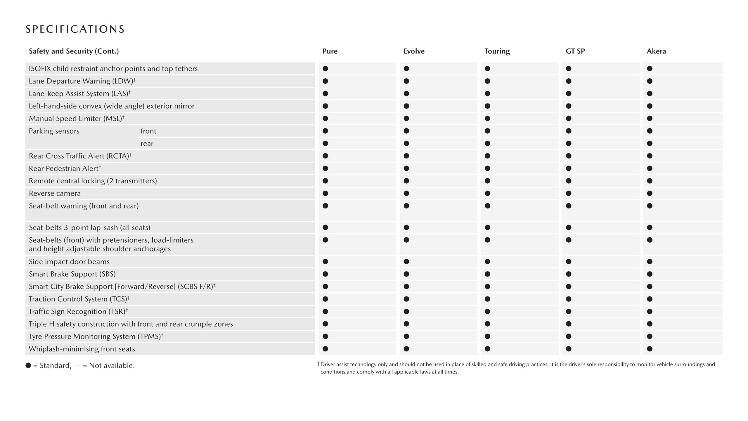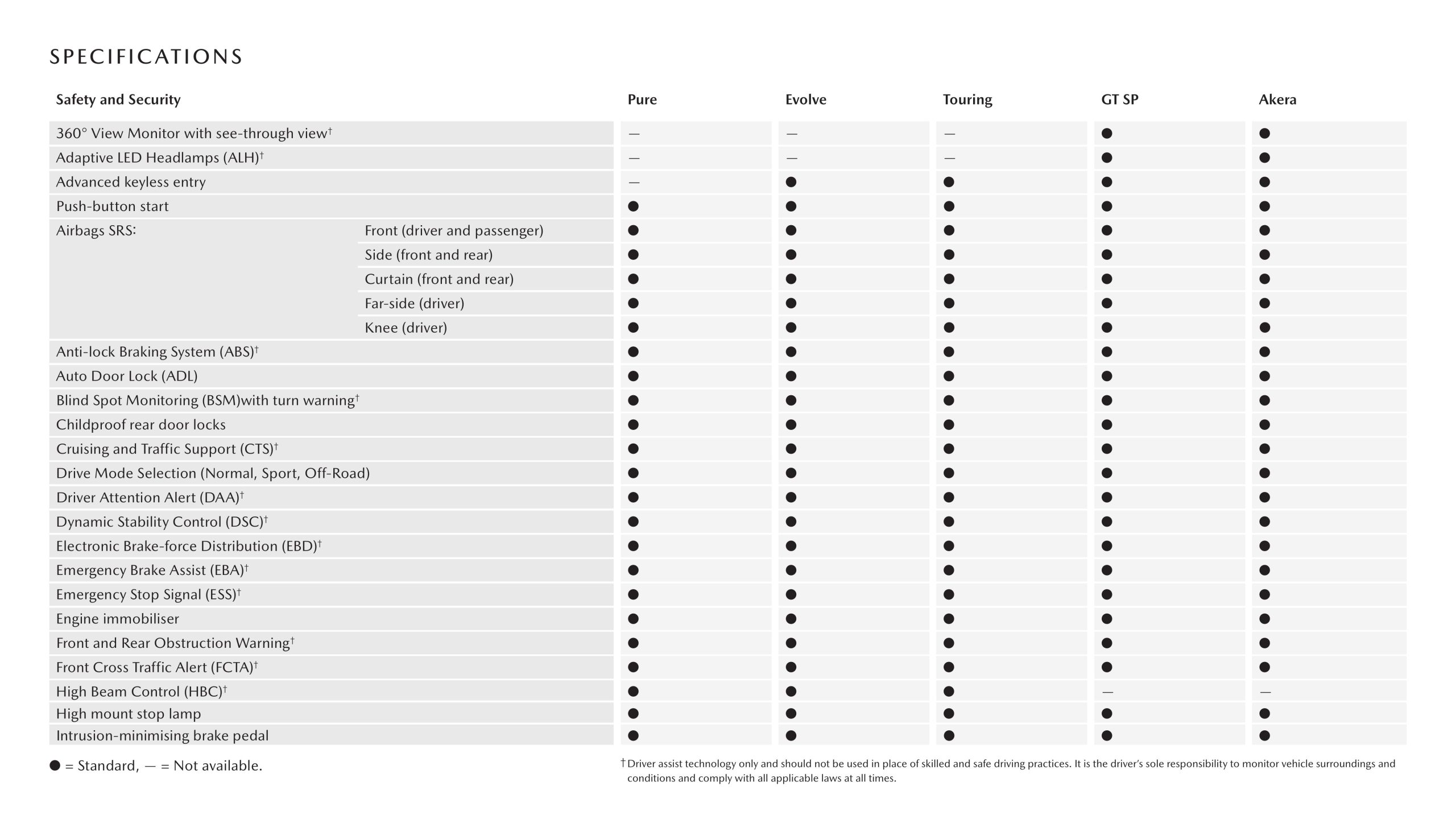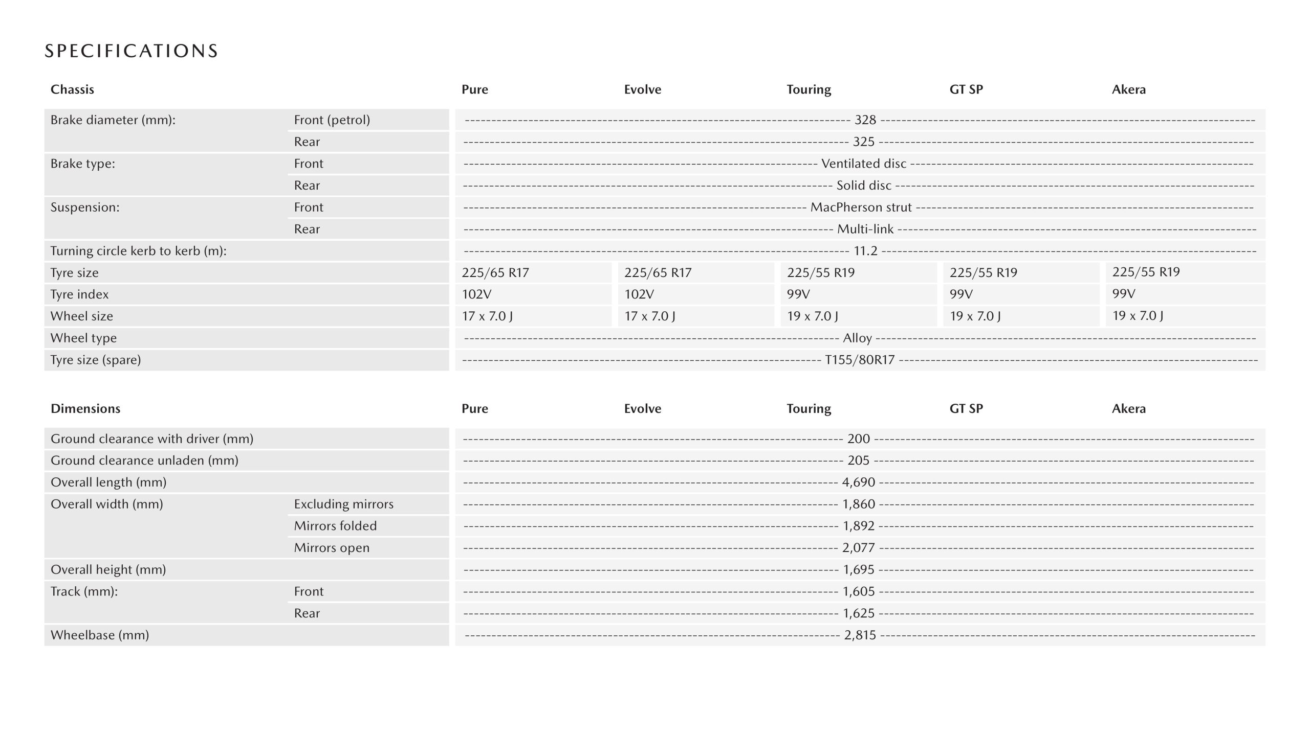- ขนาดยางและล้อ: รุ่น Pure และ Evolve ใช้ล้ออัลลอยขนาด 17 นิ้ว (ยาง 225/65 R17) ส่วนรุ่น Touring, GT SP และ Akera ใช้ล้ออัลลอยขนาด 19 นิ้ว (ยาง 225/55 R19)