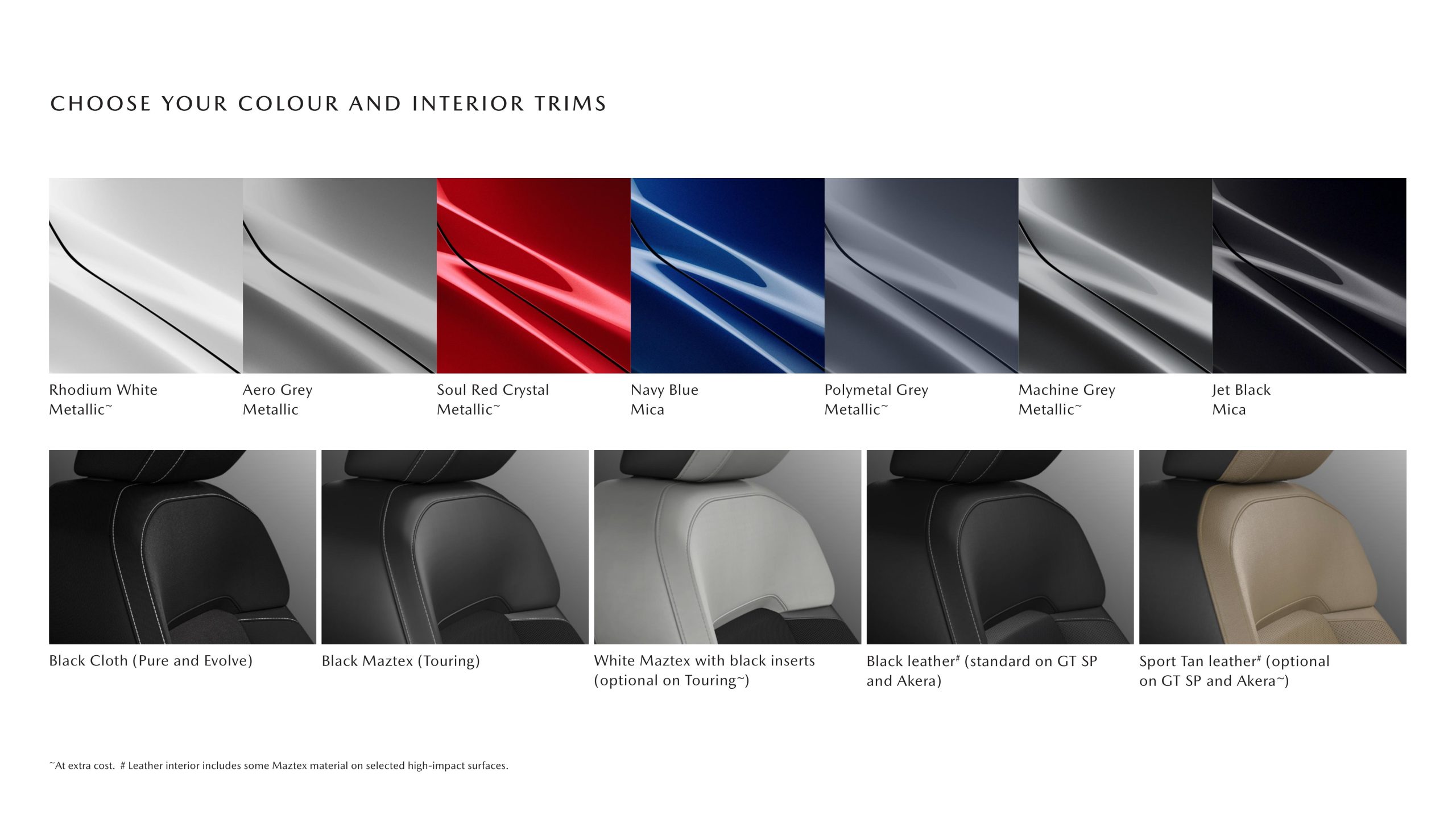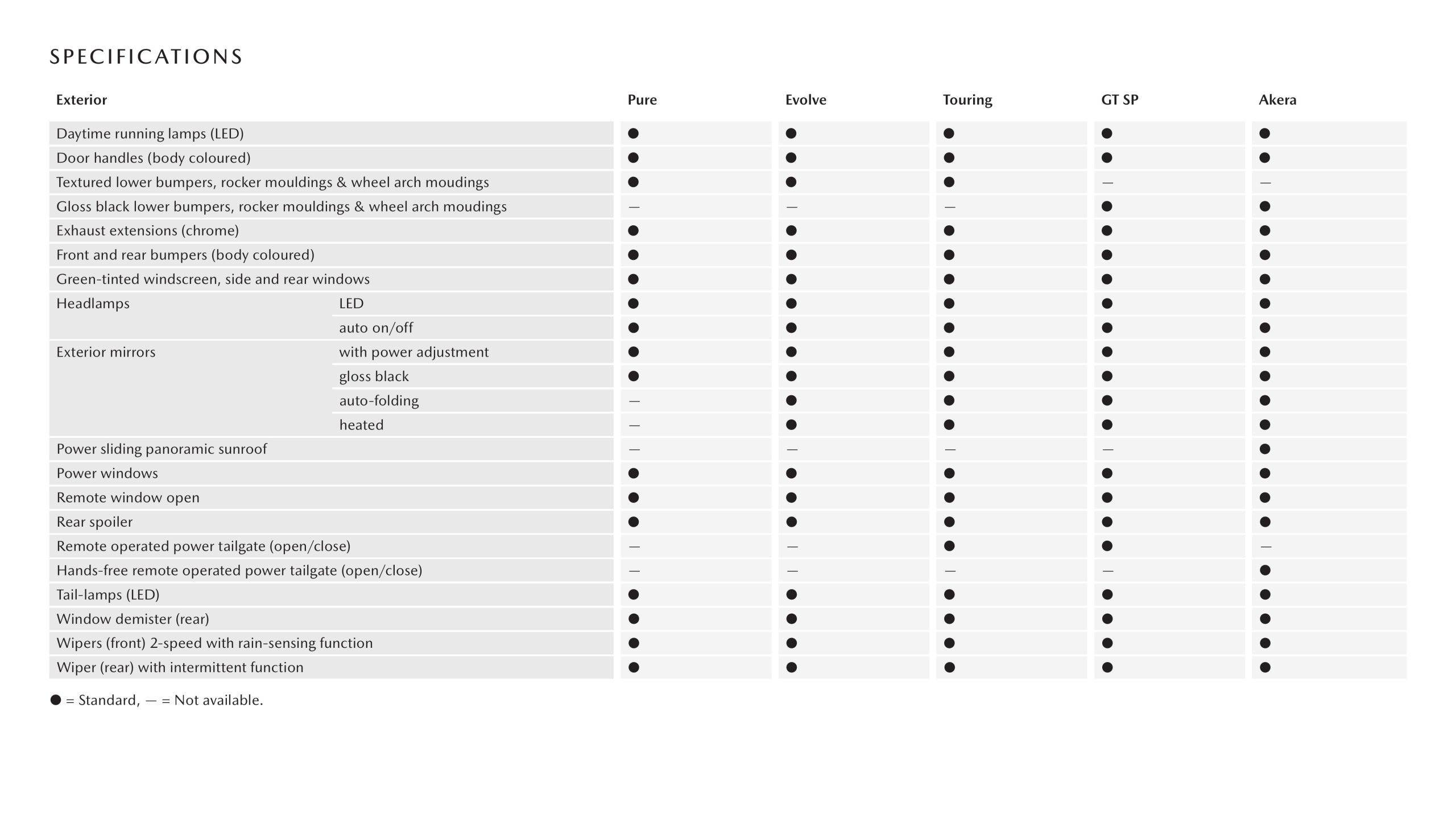 - ชุดแต่งรอบคัน: รุ่น Pure, Evolve และ Touring จะใช้คิ้วชายล่างและซุ้มล้อแบบสีดำด้าน (Textured) ส่วนรุ่น GT SP และ Akera จะอัปเกรดเป็นสีดำเงา (Gloss Black) ทั้งหมด