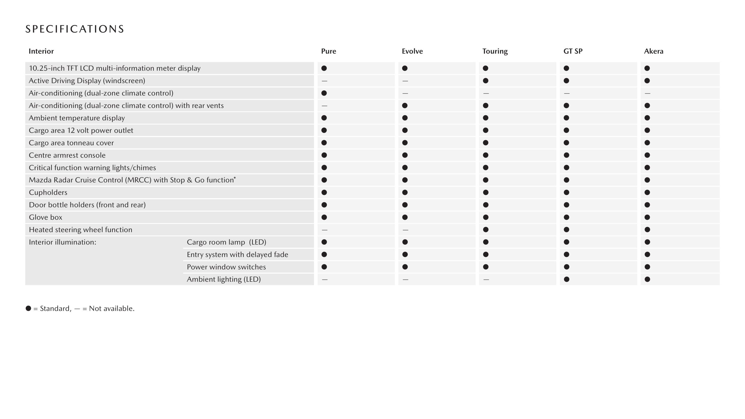 - วัสดุหุ้มเบาะ: มีให้เลือกตั้งแต่ผ้าสีดำในรุ่นเริ่มต้น, หนังสังเคราะห์ Maztex สลับหนังกลับเทียมในรุ่นกลาง ไปจนถึงหนังแท้สีดำ (Black Leather) ในรุ่นสูง และมีตัวเลือกพิเศษหนังสีน้ำตาล (Sport Tan Leather) สำหรับรุ่น GT SP และ Akera
