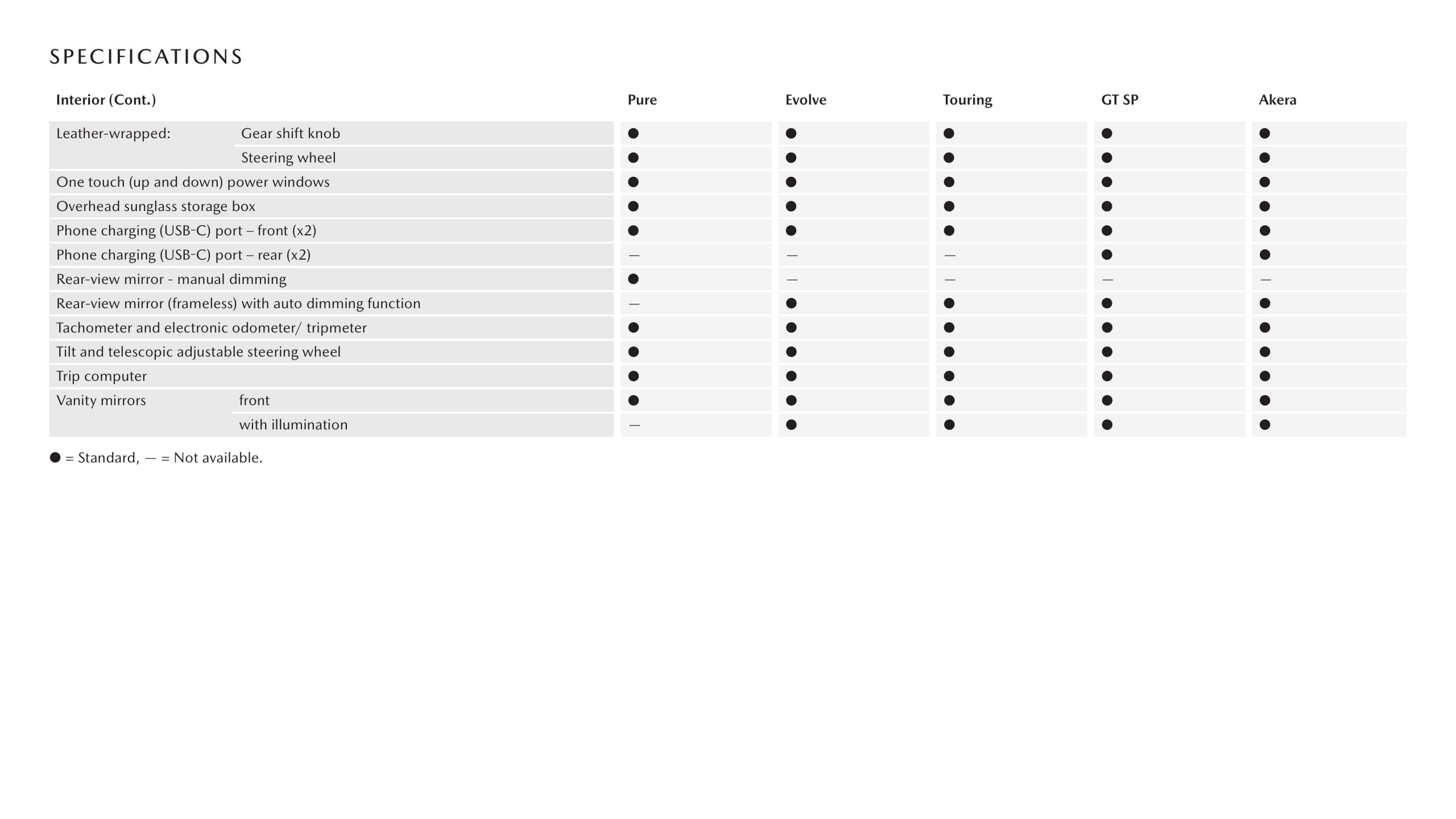 - ไฟส่องสว่าง Signature: ในรุ่น GT SP และ Akera จะมาพร้อมไฟหน้าและไฟท้ายแบบ LED Signature Illumination ที่มีเอกลักษณ์เฉพาะตัว