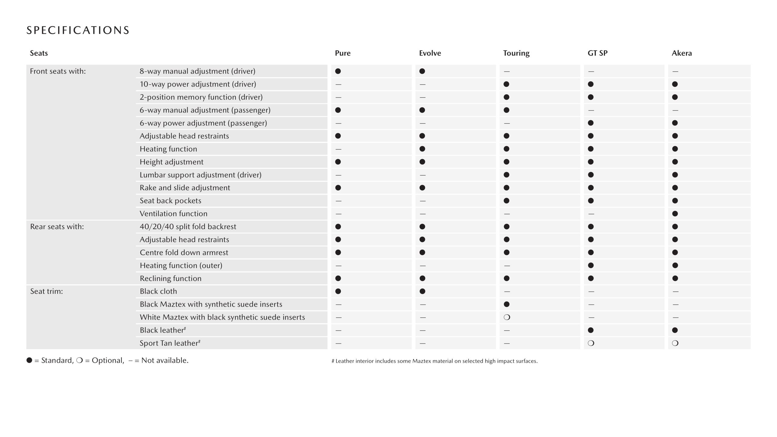 - ระบบระบายอากาศและอุ่นเบาะ: ติดตั้งระบบอุ่นเบาะคู่หน้ามาให้ตั้งแต่รุ่น Evolve และในรุ่นท็อป Akera จะเพิ่มระบบระบายอากาศ (Ventilation) ที่เบาะคู่หน้าเพื่อความสบายในสภาพอากาศร้อน