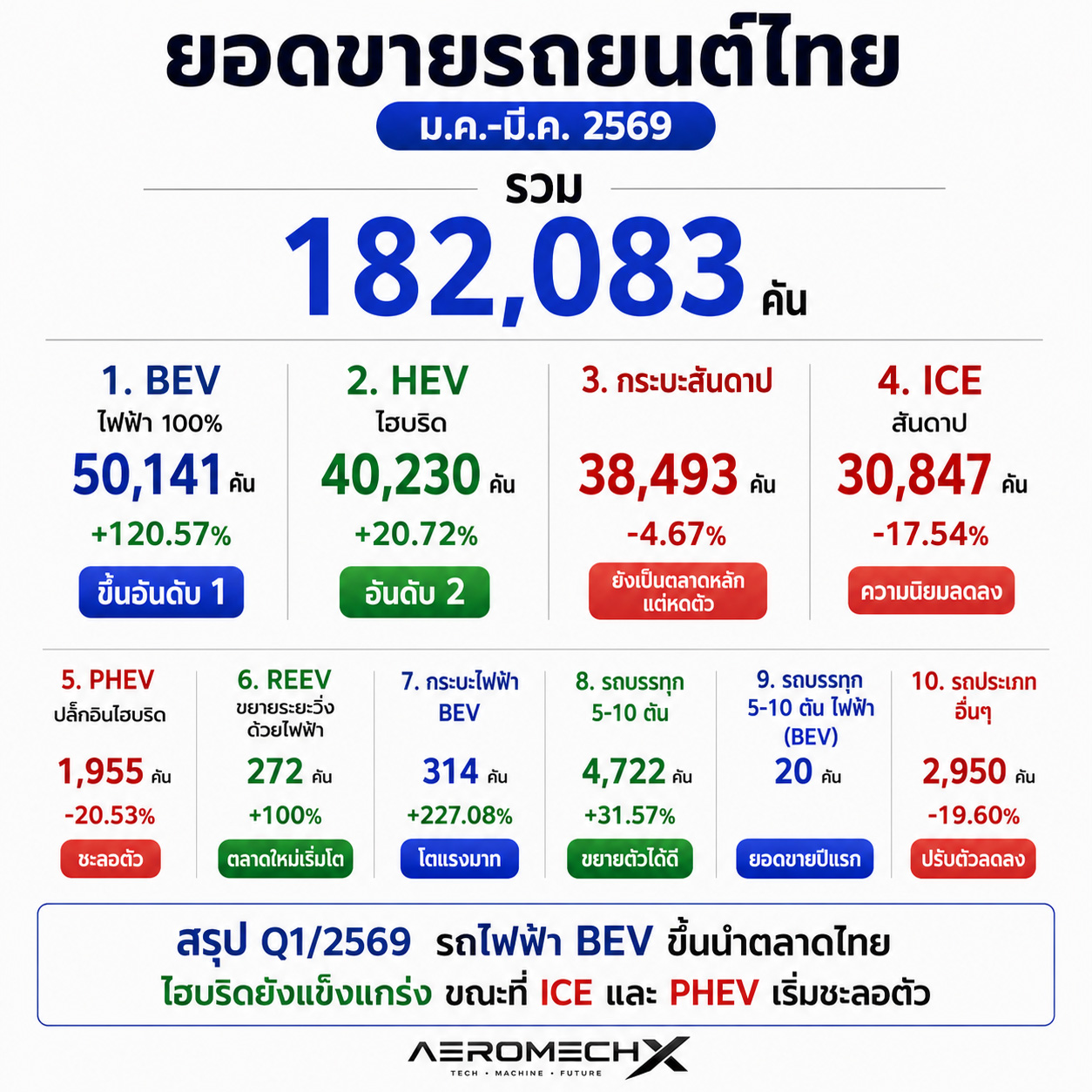 - รถยนต์ไฮบริด (HEV): มียอดขาย 40,230 คัน ครองสัดส่วน 22.09% โดยเติบโตเพิ่มขึ้น +20.72%