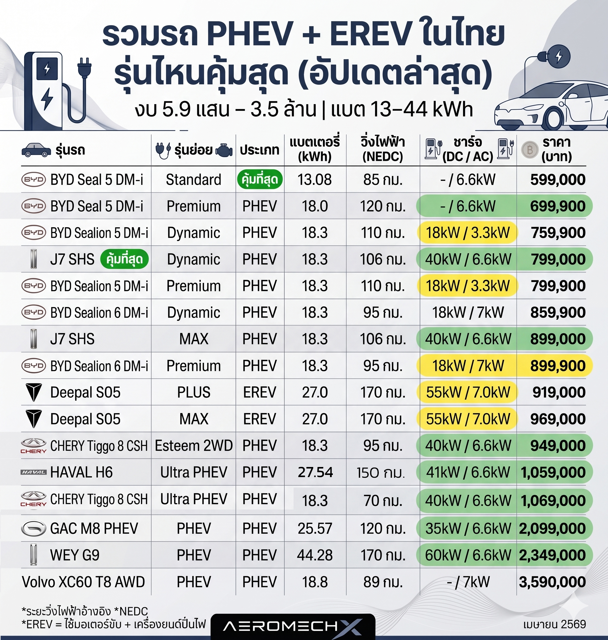 | BYD SEAL 6 | Premium ⭐ คุ้มสุด | 56.64 kWh | 100kW / 7kW | 485 กม. | 949,900 |