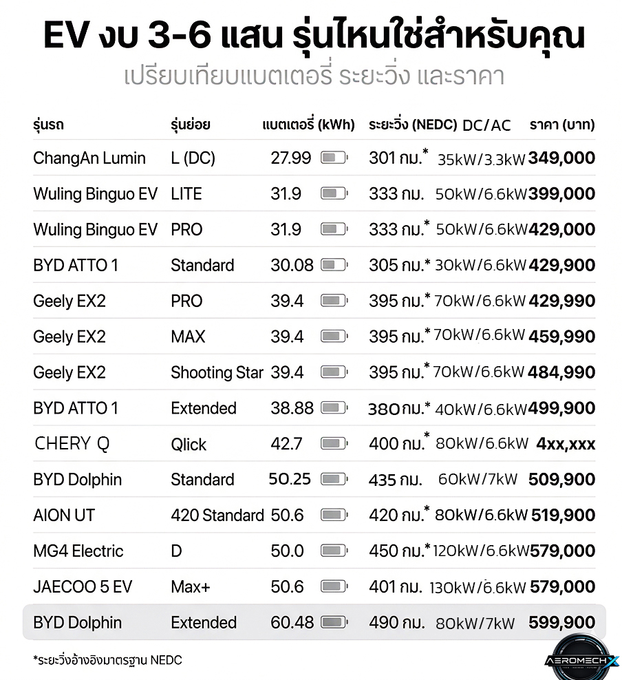 | BYD Dolphin | Extended | 60.48 kWh | 490 กม. | 80kW / 7kW | 599,900 |