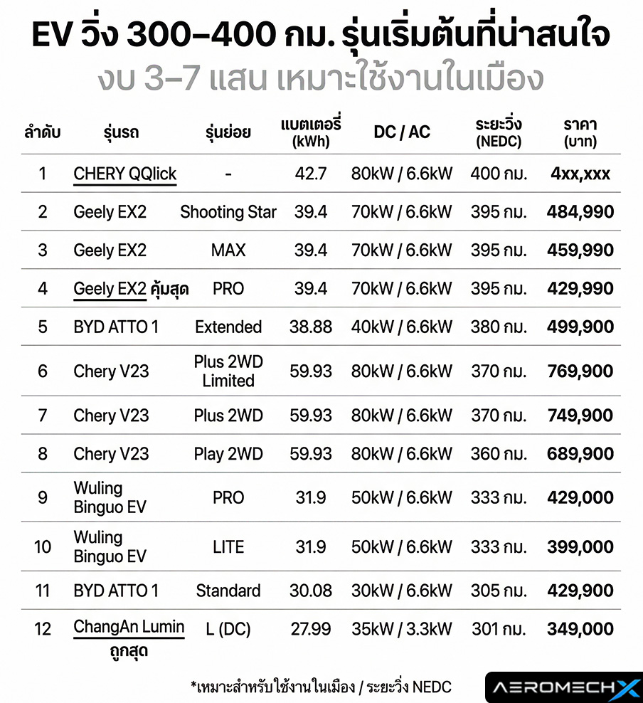 กลุ่มเริ่มต้น: งบ 3 – 6 แสนบาท (City EV & Entry-Level)