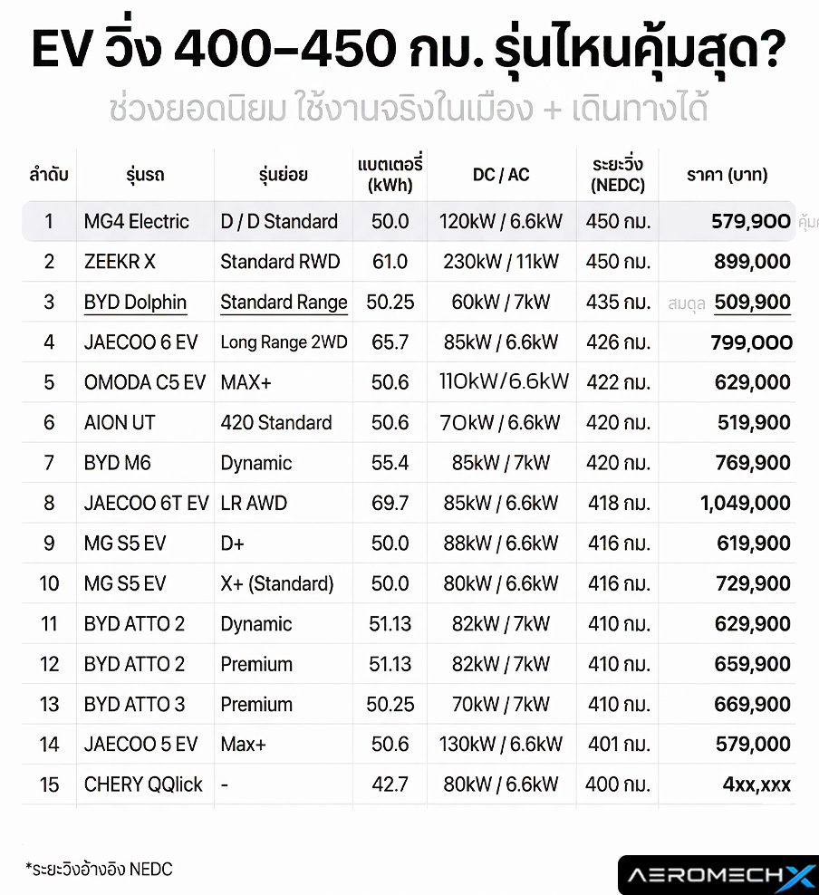 - MG (5 รุ่นย่อย): MG4 Electric (D, X Long Range), MG S5 EV (D+, X+ Standard, V+ Long Range)