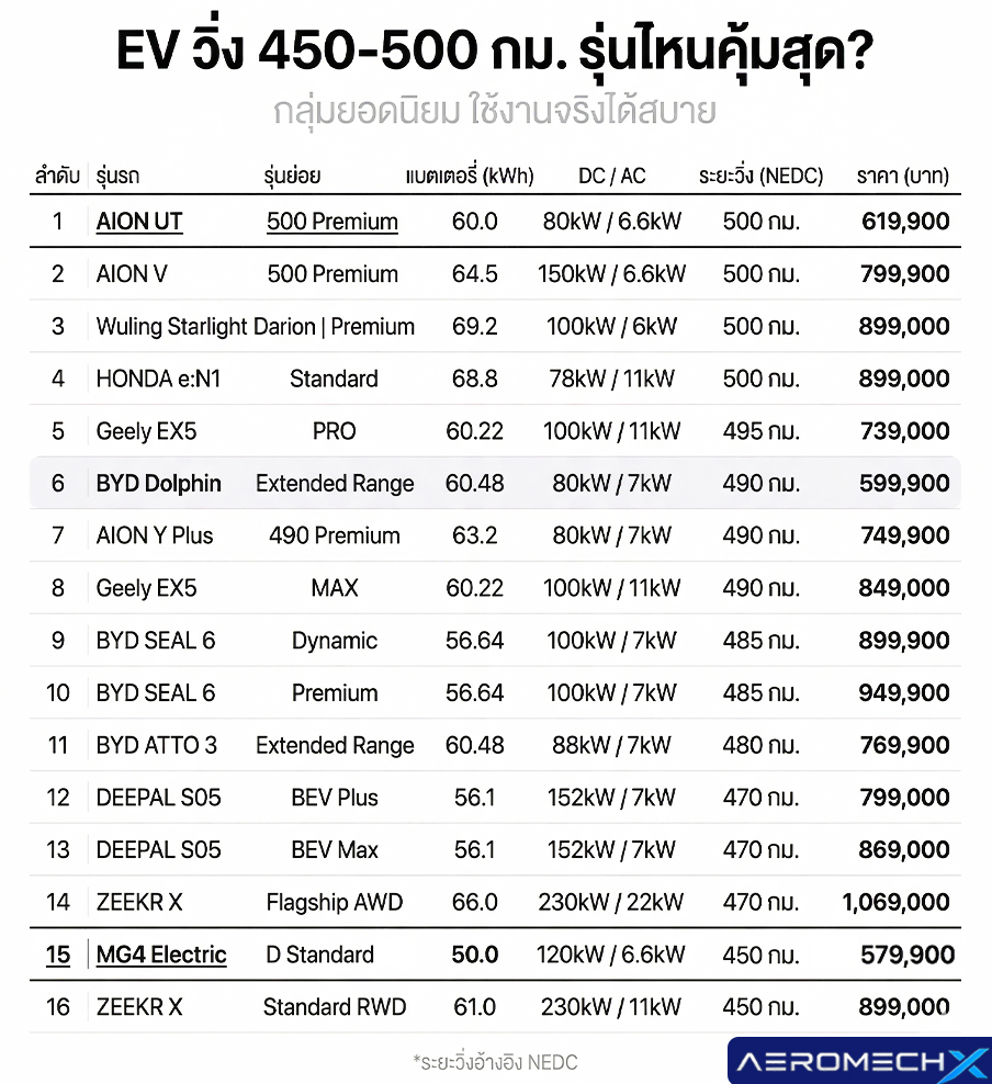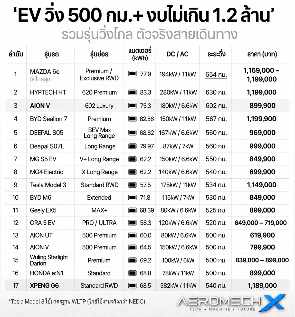 | AION V | 500 Premium | 64.5 kWh | 150kW / 6.6kW | 500 กม. | 799,900 |