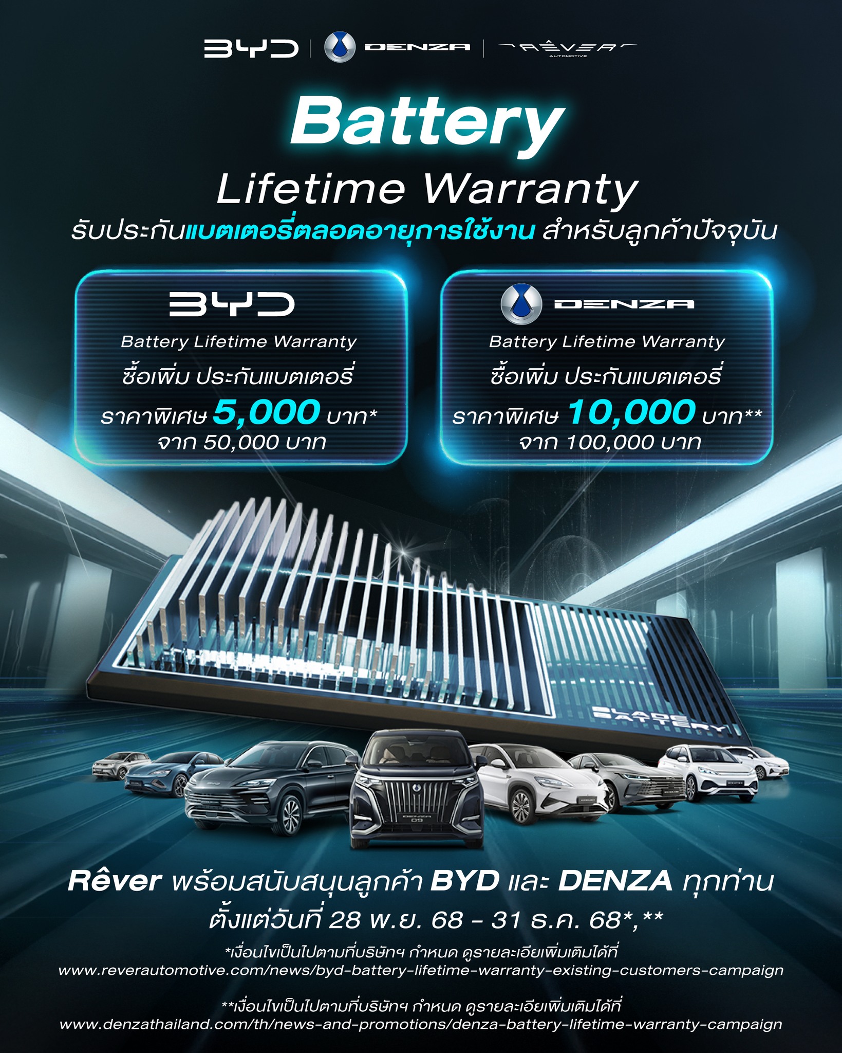 ในช่วงปลายปี 2568 นี้ Rêver Automotive ประกาศมอบสิทธิพิเศษครั้งใหญ่ให้กับลูกค้า BYD และ DENZA ทั่วประเทศไทย ด้วยแคมเปญ Battery Lifetime Warranty ที่ช่วยต่ออายุความมั่นใจเรื่องแบตเตอรี่รถยนต์ไฟฟ้า พร้อมราคาพิเศษเฉพาะช่วงโปรโมชั่นเท่านั้น เหมาะสำหรับผู้ใช้งาน EV ที่ต้องการความอุ่นใจระยะยาว และคุ้มค่าที่สุดในตลาดตอนนี้