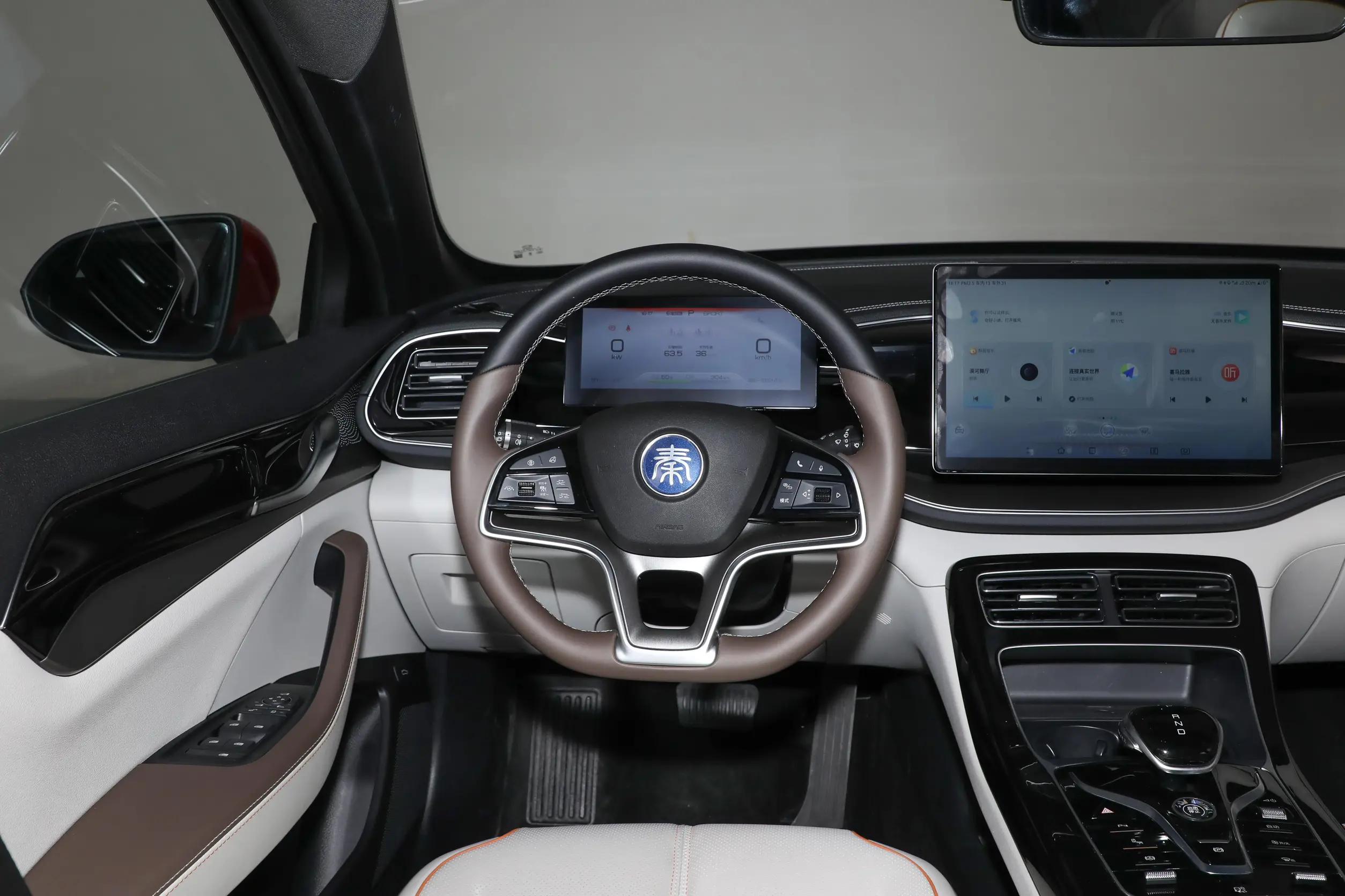 Qin PLUS EV MY2024 ภายในตกแต่งปรับเปลี่ยนรายละเอียดต่างๆอย่าง สีภายในสีน้ำตาลแดงอบอุ่น หน้าปัดแบบลอยขนาด 8.8 นิ้ว เบาะนั่งแบบสปอร์ต อัพเกรดระบบ DiLink 4.0 รวมถึงบริการเครือข่าย 4G, Wi-Fi บนรถ อัพเกรดระยะไกล OTA รุ่นไฮเอนด์จะติดตั้งลำโพง 8 ตัวและกุญแจรถอาจปรับเป็นการ์ด NFC และ กุญแจดิจิตอล