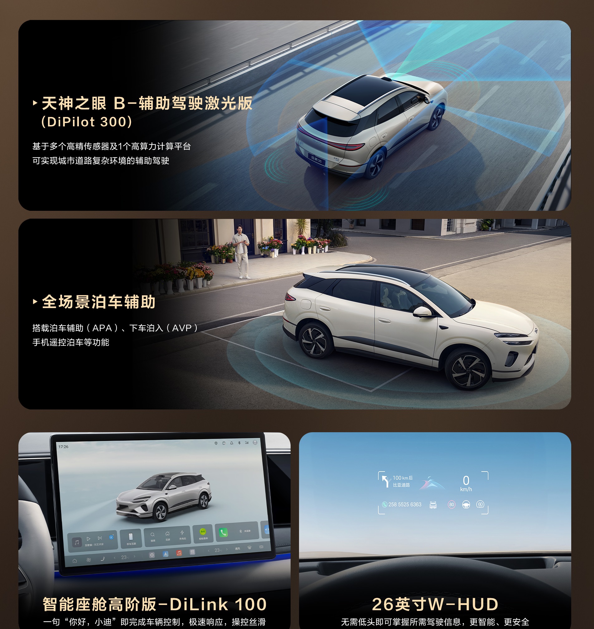 DiPilot 100 (รุ่นมาตรฐาน): ให้การขับขี่อัตโนมัติระดับ L2+ ประกอบด้วยระบบควบคุมความเร็วอัตโนมัติแบบแปรผัน (ACC), ระบบประคองรถให้อยู่ในเลน (LCC), และระบบเบรกฉุกเฉิน (AEB) ซึ่งเพียงพอต่อการใช้งานทั่วไปในชีวิตประจำวัน