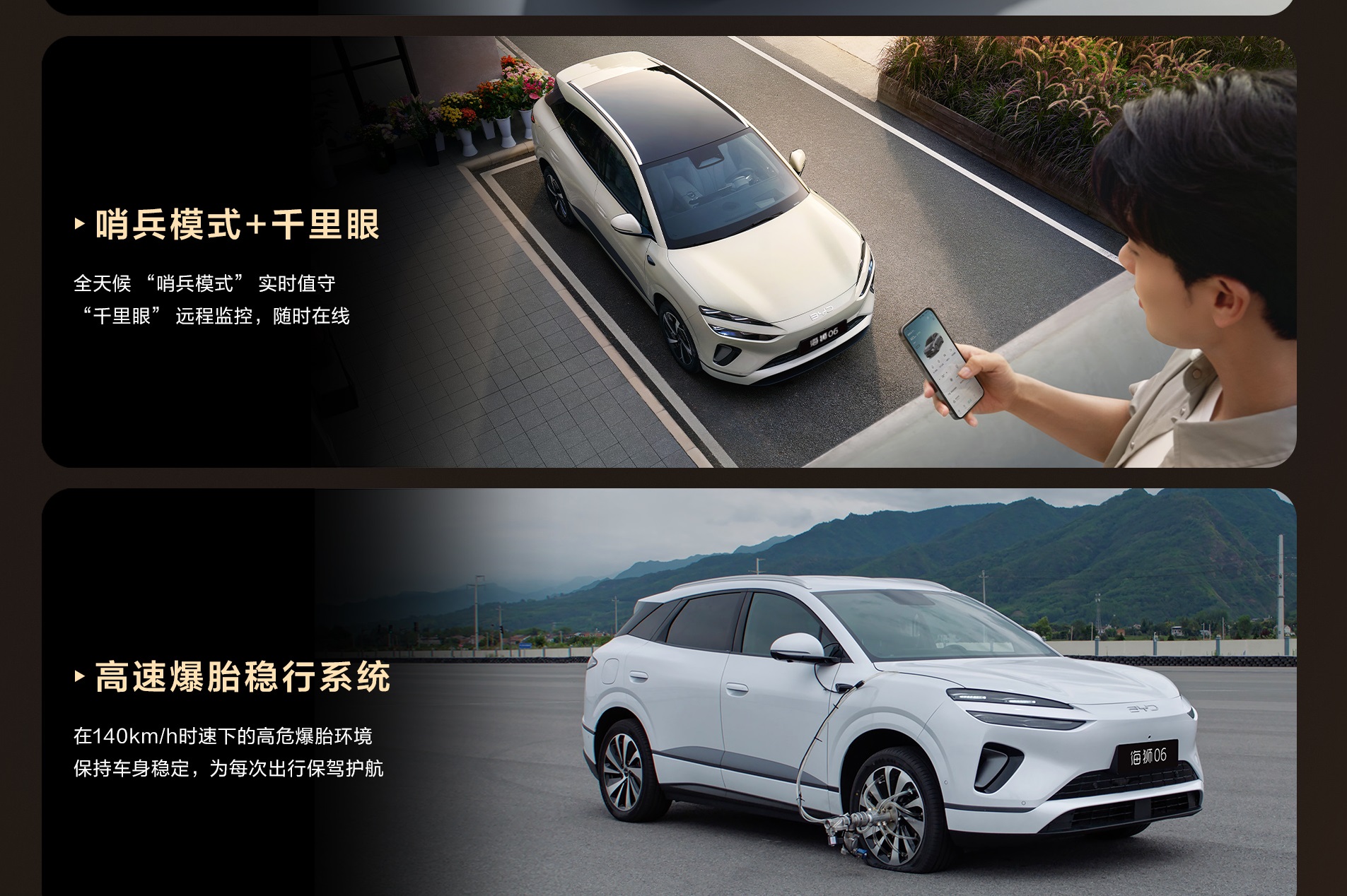 TBC (High-speed Tire Blowout Stability): ระบบช่วยคุมเสถียรภาพเมื่อ “ยางระเบิด” ที่ความเร็วสูง (สูงสุด 140 กม./ชม.) โดยระบบจะเข้าควบคุมเบรกและมอเตอร์เพื่อลดการส่ายของรถให้อยู่ในระยะไม่เกิน 0.75 เมตร