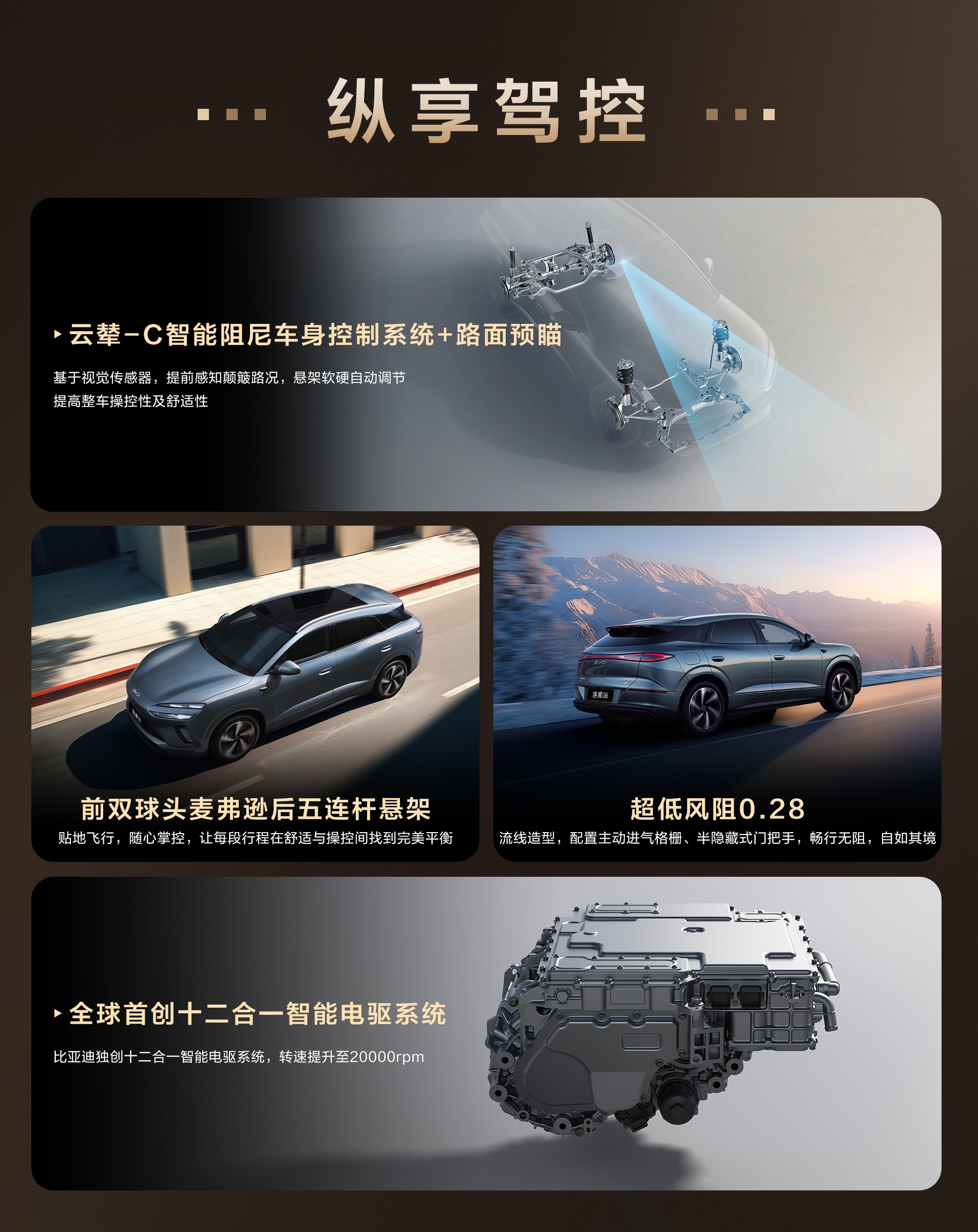 - ระบบ DiSus-C (云辇-C): เป็นระบบควบคุมหน่วงช่วงล่างอัจฉริยะที่สามารถปรับความหนืดของโช้คอัพได้แบบเรียลไทม์ตามสภาพถนน ถ้าเจอทางขรุขระจะปรับให้นุ่ม แต่ถ้าสาดโค้งจะปรับให้แข็งขึ้นเพื่อลดการโยนตัว