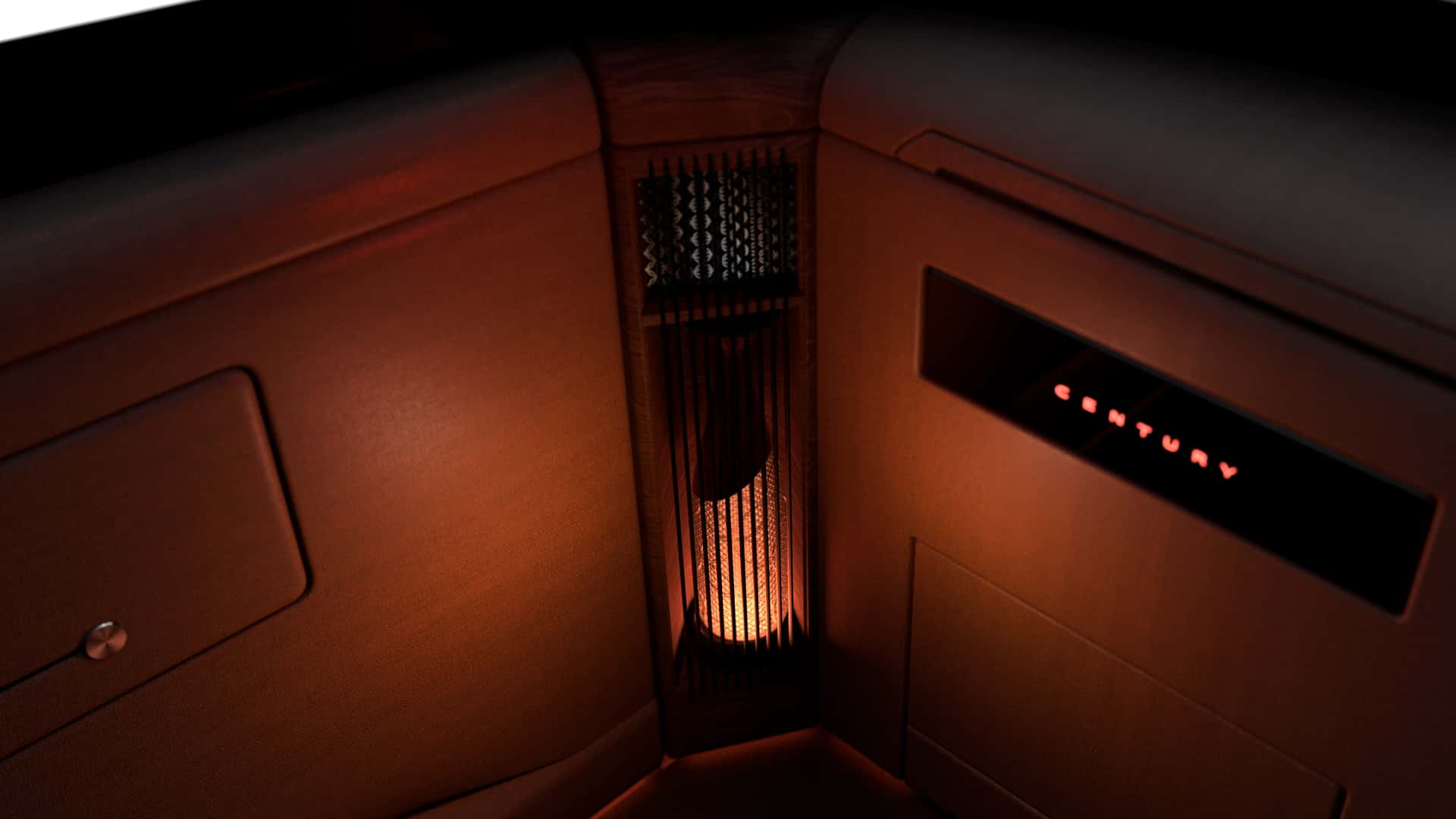ภายในของ Century Coupe ออกแบบในสไตล์ สี่ที่นั่ง (4-Seater Layout) พร้อมพวงมาลัยแบบ Yoke Steering ที่ให้ความรู้สึกเหมือนเครื่องบินเจ็ตส่วนตัว ตรงกลางมีแนวสันนูนแบ่งแยกพื้นที่ซ้ายขวา ทั้งตอนหน้าและตอนหลัง เพื่อความเป็นส่วนตัว หน้าจอกลางถูกออกแบบให้เรียบหรู ขนาดเล็กแบบ “สมาร์ตโฟน” และ ไม่มีเสากลาง (B-Pillar) ทำให้การเข้าออกจากเบาะหลังสะดวกและสง่างามยิ่งขึ้น