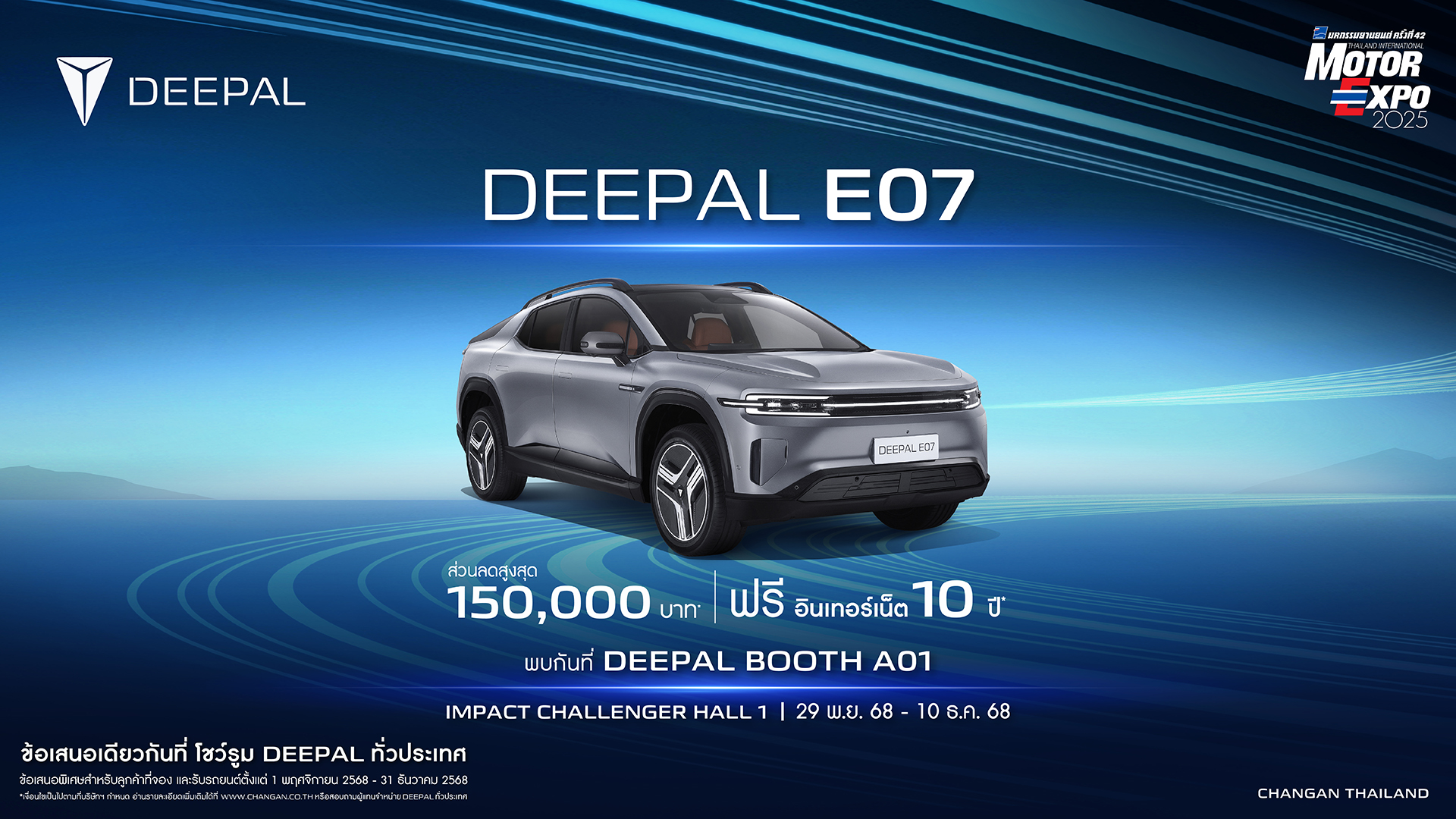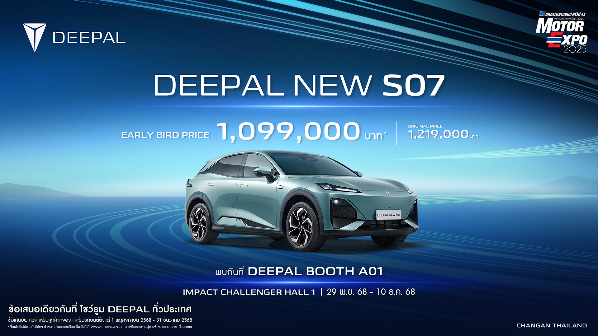 - ราคาพิเศษ 1,099,000 บาท (จากราคา 1,219,000 บาท) สำหรับลูกค้าที่จอง DEEPAL New S07 ตั้งแต่วันที่ 20 ตุลาคม 2568 จนถึงวันที่ 31 ธันวาคม 2568 และรับรถภายในวันที่ 31 ธันวาคม 2568