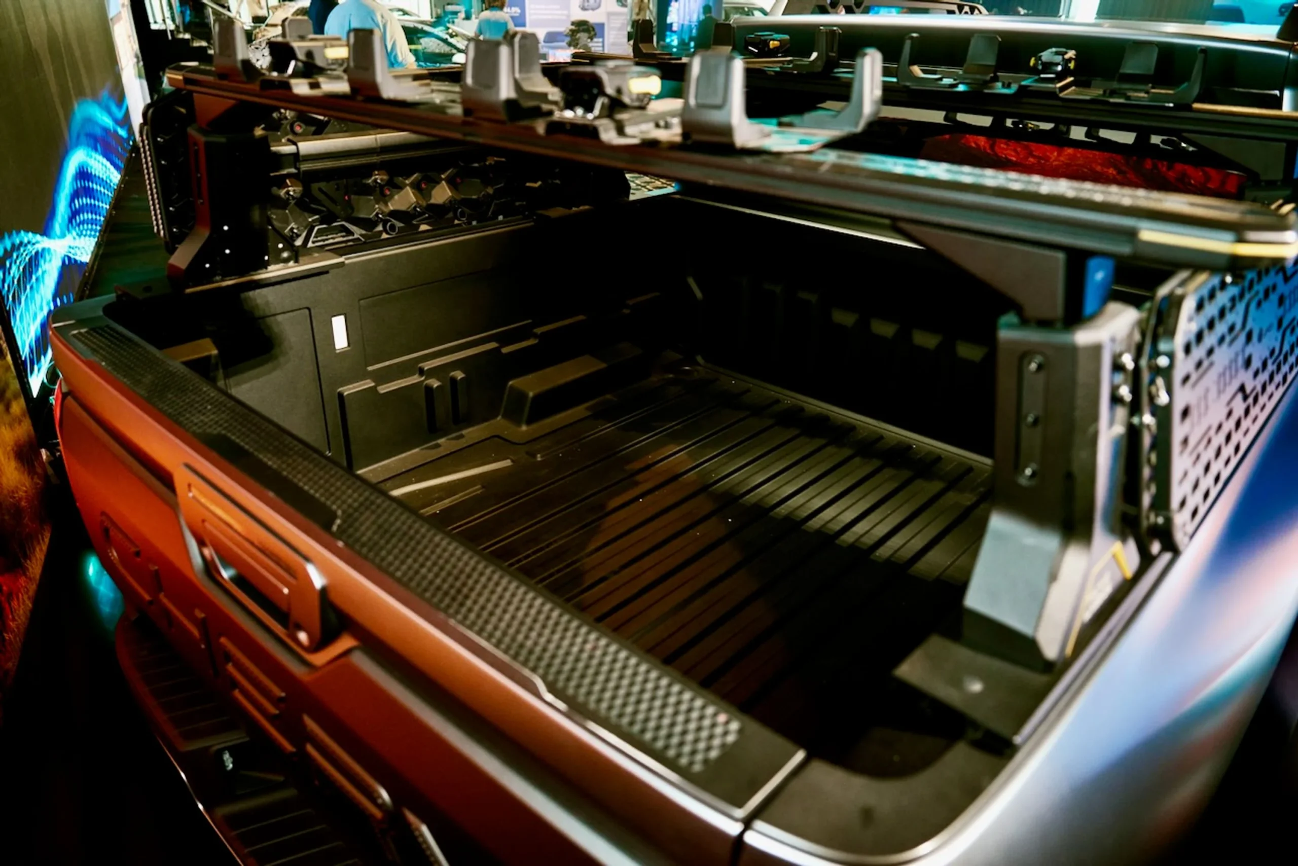 ภาพต้นแบบแสดงเส้นสายที่ได้รับแรงบันดาลใจจาก Ford Bronco ผสานความดุดันแบบกระบะอเมริกัน ด้านท้ายมีบันไดในกันชนเพื่อความสะดวกในการขึ้น-ลงกระบะท้าย พร้อมดีไซน์กระบะยกสูงเพื่อลดการรุกล้ำพื้นที่จากซุ้มล้อ