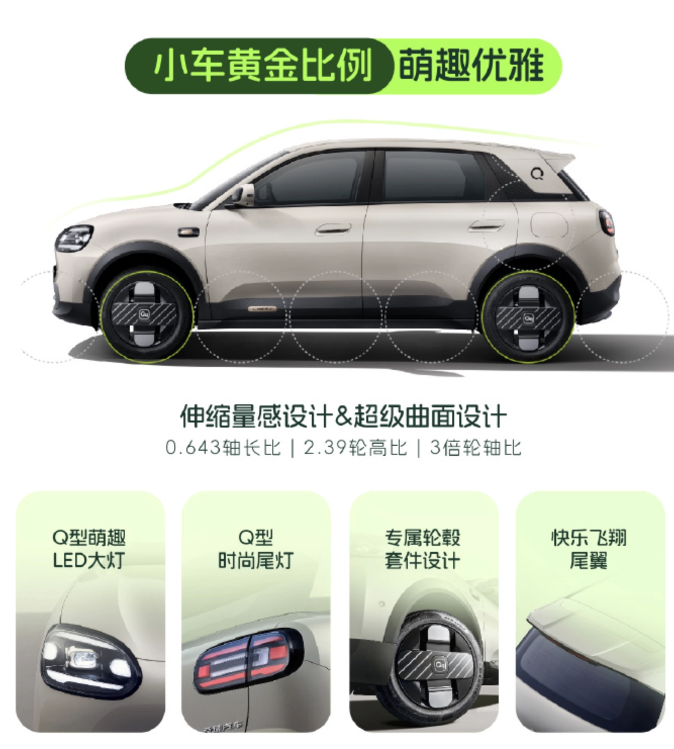 - ชุดไฟหน้า: ไฟหน้า LED รูปทรงตัว Q ที่เป็นเอกลักษณ์ พร้อมกระจังหน้าแบบปิดตามสไตล์รถไฟฟ้า