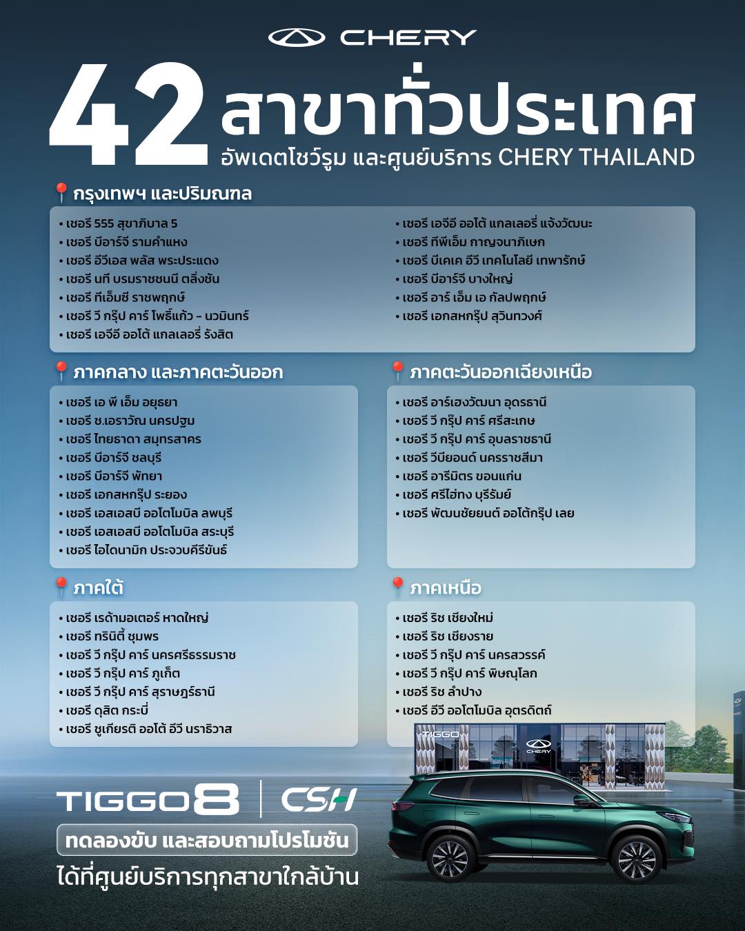 นี่คือรายชื่อ โชว์รูมและศูนย์บริการ Chery (เชอรี) ในประเทศไทย ทั้งหมดในประเทศไทย 42 แห่ง