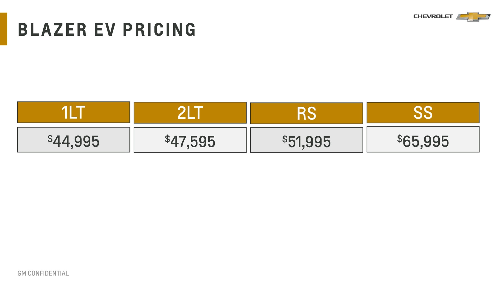 Chevrolet Blazer EV ครอสโอเวอร์ไฟฟ้าใหม่ ที่มีราคาจำหน่ายเริ่มต้นที่ 44,995 ดอลลาร์ สำหรับรุ่น 1LT ระดับเริ่มต้น หรือประมาณ 1.58 ล้านบาท ในเกรด SS ท๊อปราคา 65,995 ดอลลาร์ หรือประมาณ 2.31 ล้านบาท