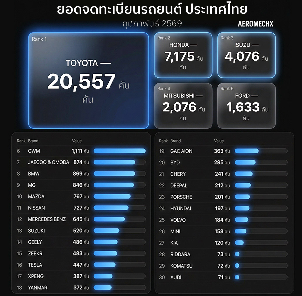 เผยยอดจดทะเบียนรถยนต์ ก.พ.2569 : ในไทย BYD ต่ำเหลือ 295 คัน TOYOTA : 20,557 คัน