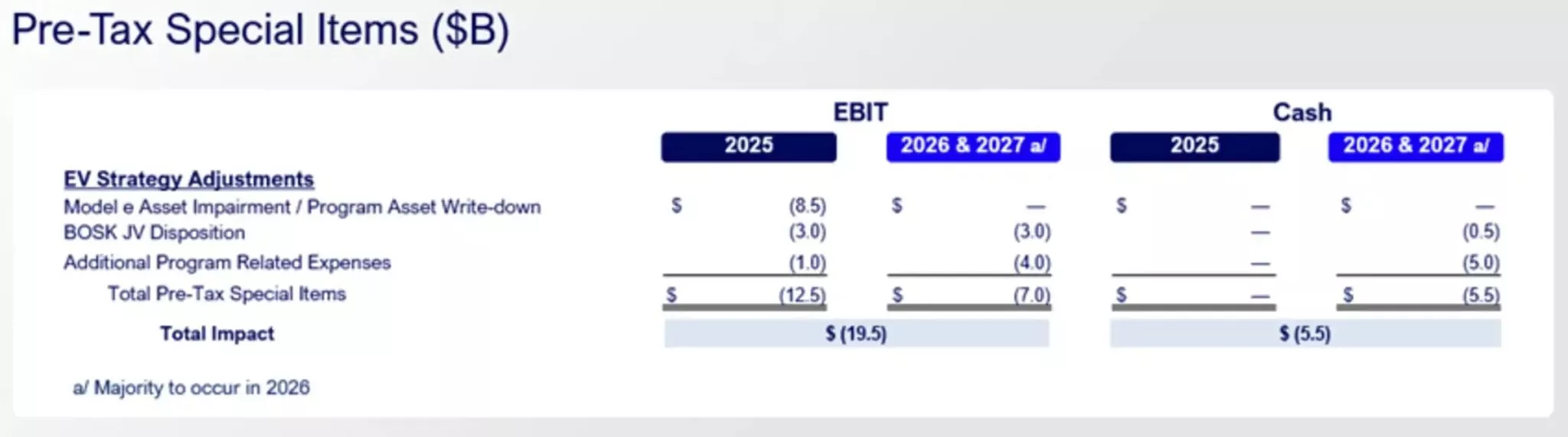 Ford ประกาศอย่างเป็นทางการว่าจะบันทึกรายการพิเศษทางการเงิน (Special Items) รวมมูลค่าสูงถึง 19.5 พันล้านดอลลาร์สหรัฐ หรือประมาณ 612,885 ล้านบาท จากการปรับโครงสร้างสินทรัพย์ EV และแผนผลิตภัณฑ์ในสหรัฐอเมริกา ซึ่งถือเป็นหนึ่งในตัวเลขการขาดทุนจาก EV ที่สูงที่สุดในประวัติศาสตร์อุตสาหกรรมรถยนต์