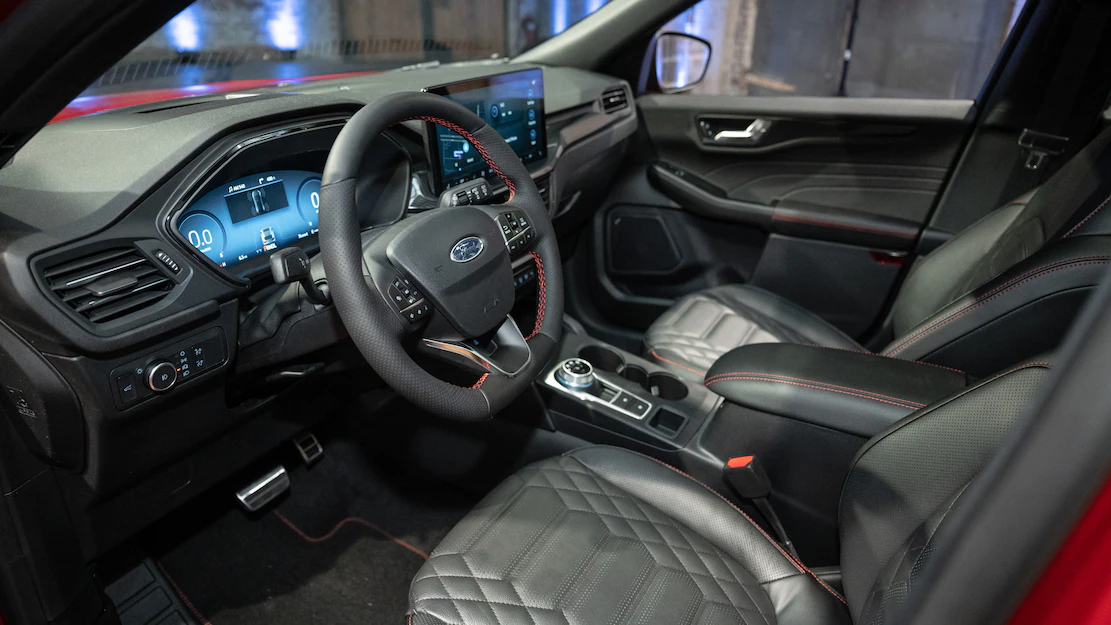 บภายในห้องโดยสารของ Kuga/Escape ST-Line ติดตั้งหน้าจอสัมผัสส่วนกลางขนาด 13.2 นิ้วปรับปรุงใหม่ระบบอินโฟเทนเมนต์ SYNC4 ล่าสุดของฟอร์ด พร้อม Apple CarPlay แบบไร้สายและ Android Auto แผงหน้าปัดดิจิตอลที่ได้รับการปรับปรุง 12.3 นิ้ว แพร้อมระบบ ADAS แท่นชาร์จสมาร์ทโฟนไร้สาย