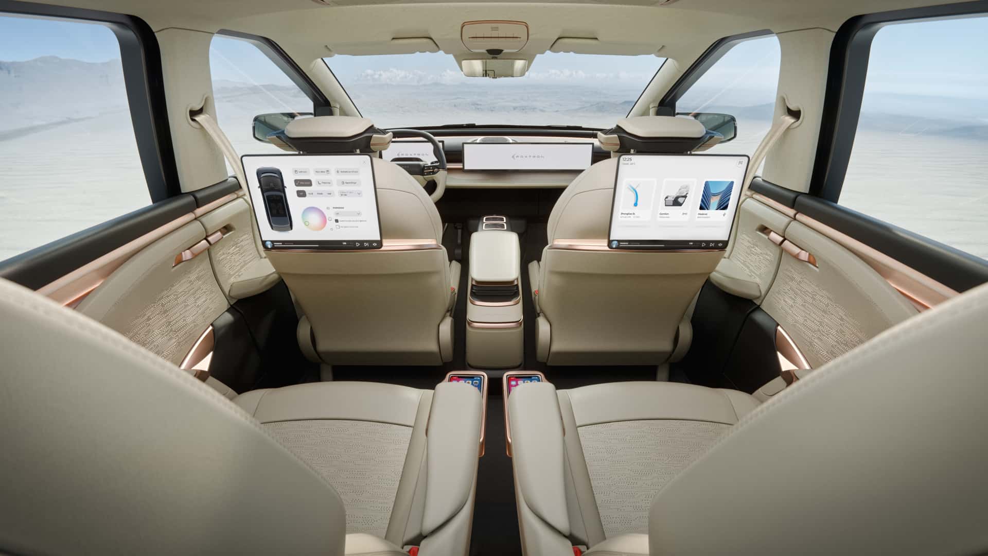 ภายในรถยนต์รุ่น D ได้รับการออกแบบมาเพื่อใช้ประโยชน์จากผลิตภัณฑ์อื่นๆ ที่ผลิตโดย Foxconn ให้ได้มากที่สุด โดยเก้าอี้แบบ 6 ที่นั่งจะมีแผ่นรองชาร์จสำหรับ iPhone และพนักพิงเบาะหน้าแต่ละด้านจะมีช่องสำหรับ iPad
