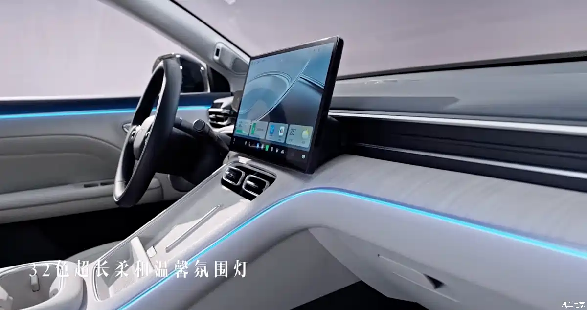 ภายในเน้นสไตล์มินิมอลแต่พรีเมียมด้วยโทนสีทูโทน แบ่งส่วนบน–ล่างด้วยวัสดุเมทัลลิก พร้อมไฟ Ambient 32 สี สร้างบรรยากาศเหมือนห้องนั่งเล่นที่ออกแบบอย่างตั้งใจ แผงหน้าปัดเป็นจอคู่ลอยทรงเหลี่ยมแบบใหม่ ใต้คอนโซลมีแท่นชาร์จไร้สาย 2 จุด พวงมาลัยแบบลูกกลิ้งดีไซน์เรียบหรู และยังคงใช้มือจับเปิดประตูแบบกลไก (ไม่ใช่ปุ่มไฟฟ้า)
