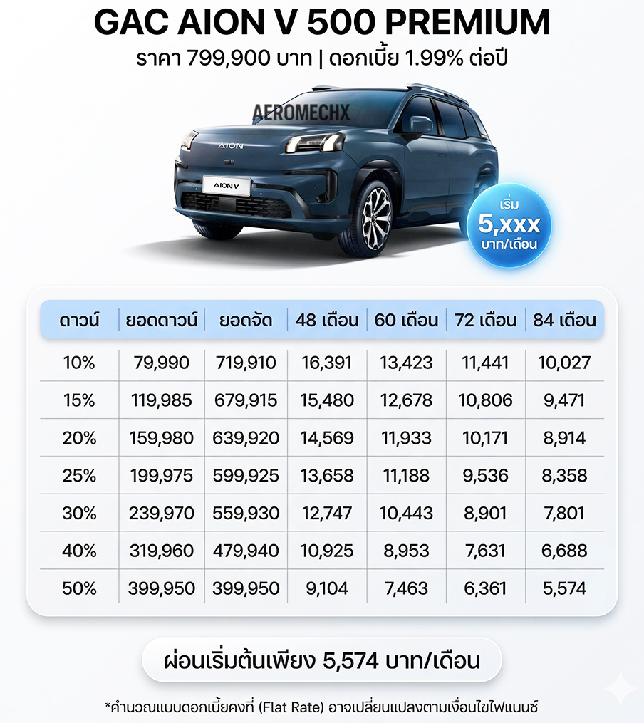 | AION V 500 Premium | 799,900.- | 799,900.- | รุ่นเริ่มต้นใหม่ล่าสุด |