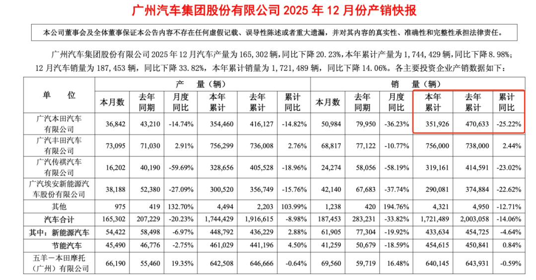 หนึ่งในจุดที่ถูกจับตาคือ GAC Honda ซึ่งรายงานระบุว่ายอดขายสะสม ณ สิ้นปีล่าสุดอยู่ที่ 351,900 คัน ลดลง 25.22% เมื่อเทียบปีก่อน และเป็นแบรนด์ที่ยอดขายหดตัว “มากที่สุด” ภายในเครือ