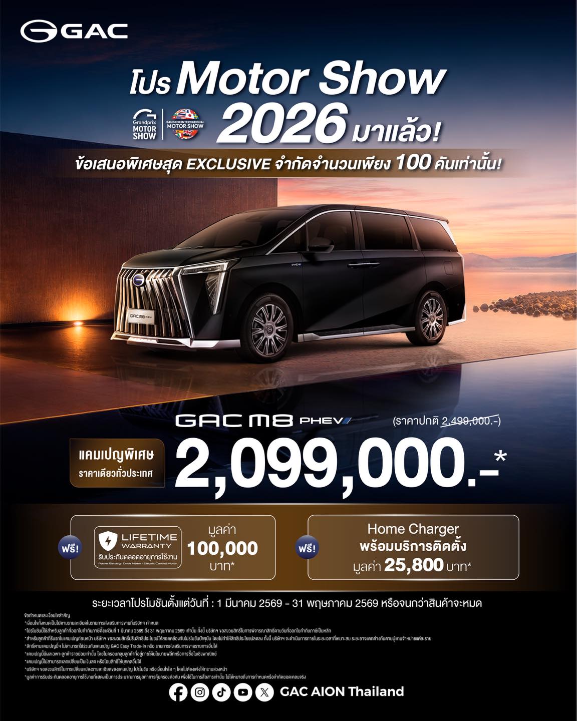 ยกระดับการเดินทางสู่บทใหม่กับรถ MPV ระดับพรีเมียม GAC M8 PHEV ที่มาพร้อมข้อเสนอสุดพิเศษ Exclusive กว่าใคร สำหรับลูกค้าที่จองและออกรถในช่วงแคมเปญนี้เท่านั้น จำกัดจำนวนเพียง 100 คันทั่วประเทศ!