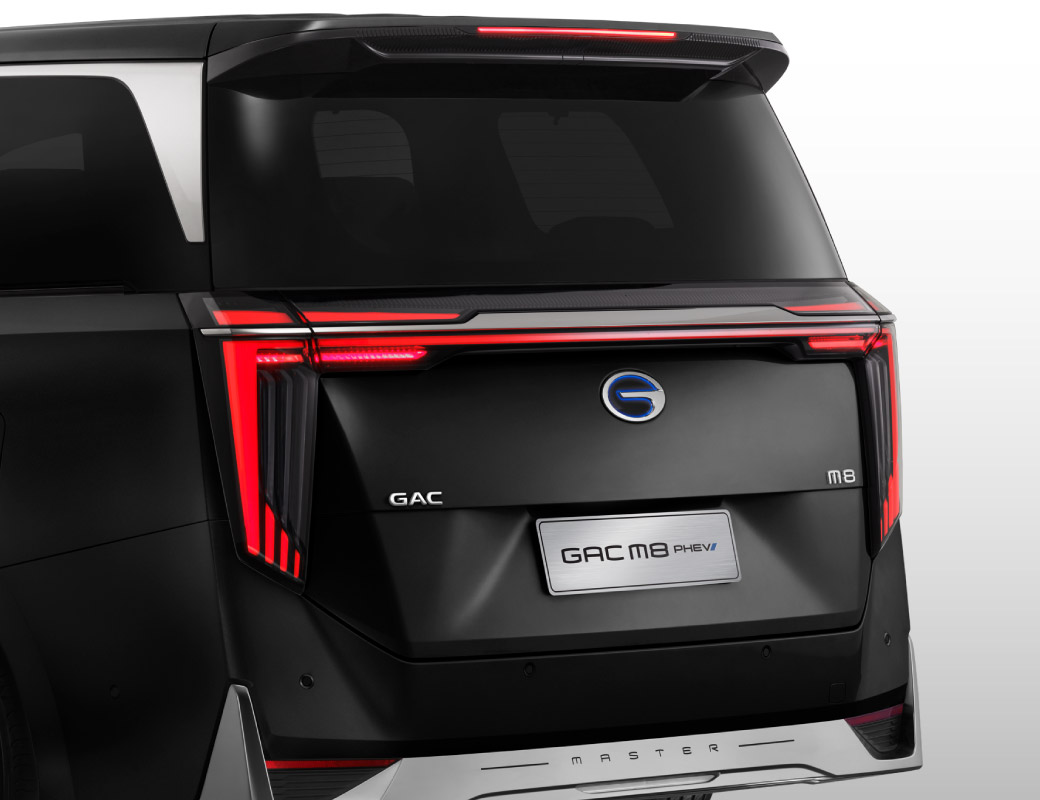 GAC Trumpchi M8 พร้อมการออกแบบที่ยอดเยี่ยม กระจังหน้าแนวนอนแบบปิด แถบไฟหน้ารูป 7 แบบ LED ที่ซับซ้อน บานประตูแบบเลื่อนไฟฟ้าทั้ง 2 ฝั่ง ไฟท้าย “Gate of Time and Space” แบบ LED รูปตัว L ลากเลื่อมทั้งสองฝั่ง
