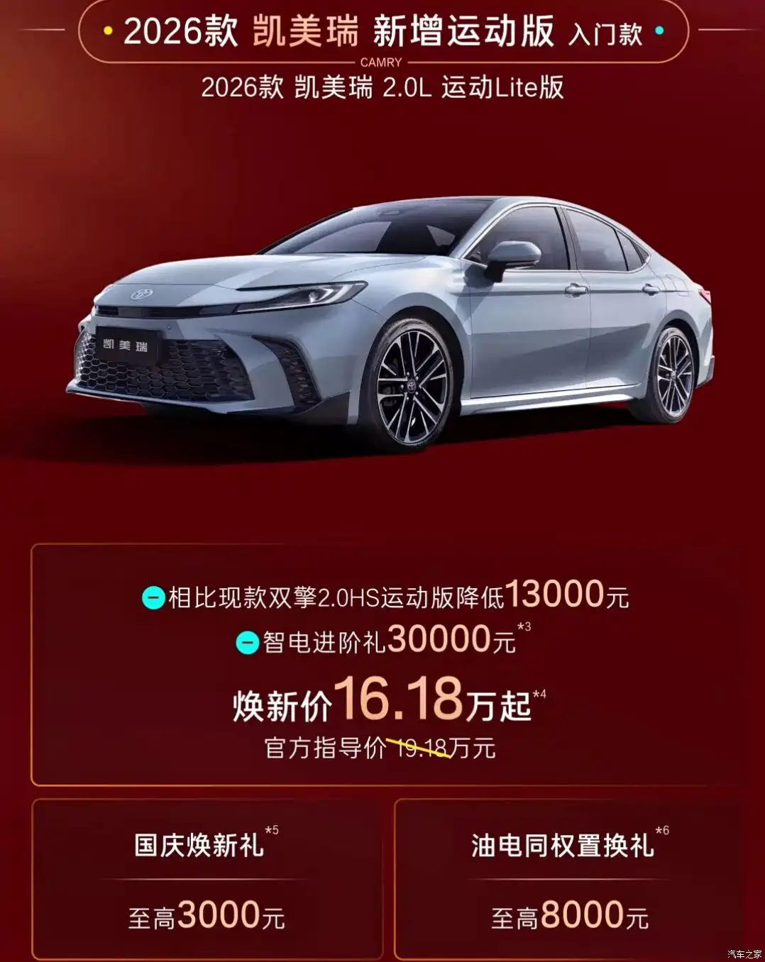 Toyota Camry รุ่นปี 2026 (ใหม่) เพิ่มรุ่น Sport Lite (2.0L) รุ่นเริ่มต้น เดิมราคา 191,800 หยวน หรือ 871,000 บาท ลดเหลือ 161,800 หยวนเท่านั้น หรือประมาณ 737,000 บาท