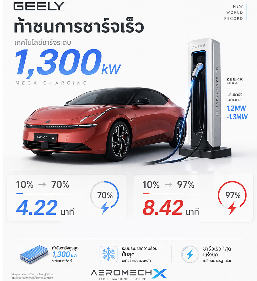 - Geely/Zeekr: ใช้ตู้ชาร์จ Zeekr V4 Megawatt ที่จ่ายไฟสูงสุดได้ถึง 1,300kW และกระแสไฟ 1,300A มาพร้อมระบบระบายความร้อนด้วยของเหลวแบบเต็มระบบ (Full Liquid-cooling) เพื่อจัดการกับความร้อนมหาศาลขณะชาร์จ