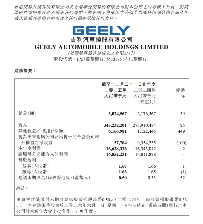 Geely Automobile ทุบสถิติใหม่! โกยรายได้ปี 2025 ทะลุ 1.6 ล้านล้านบาท กำไร 67,620 ล้านบาทในงบปี 2025