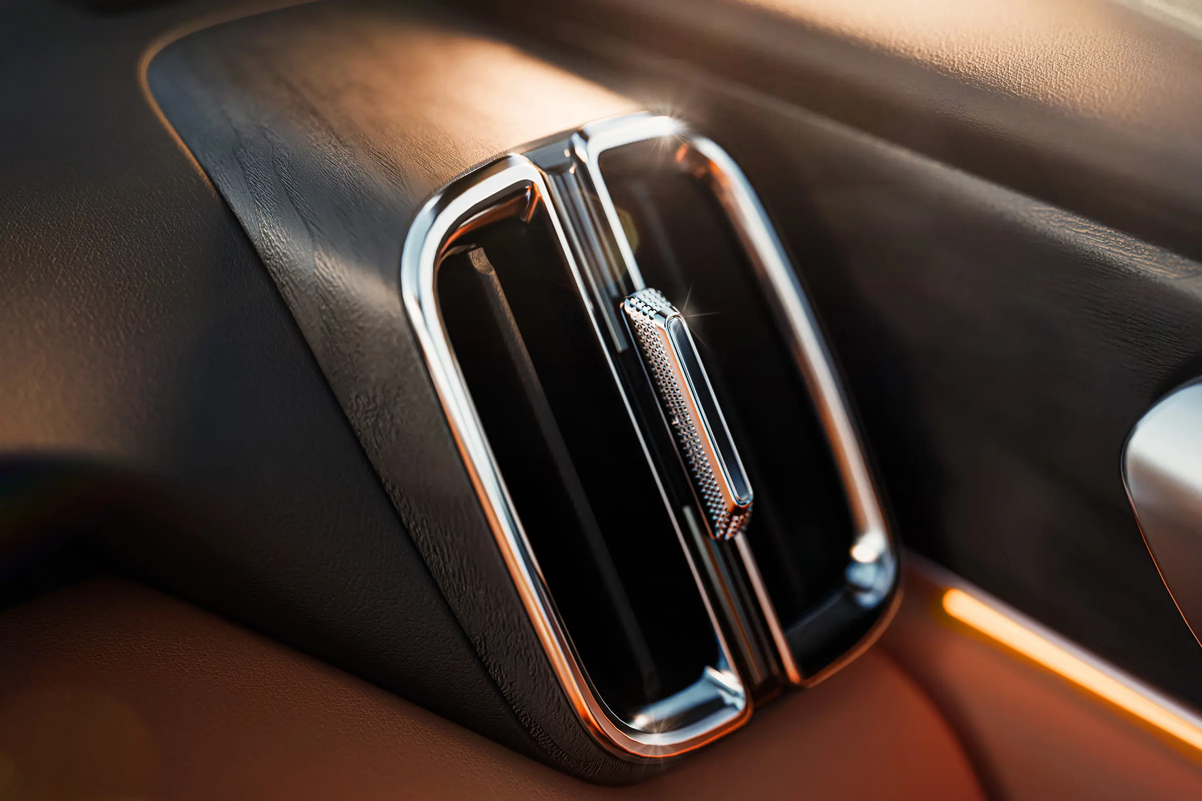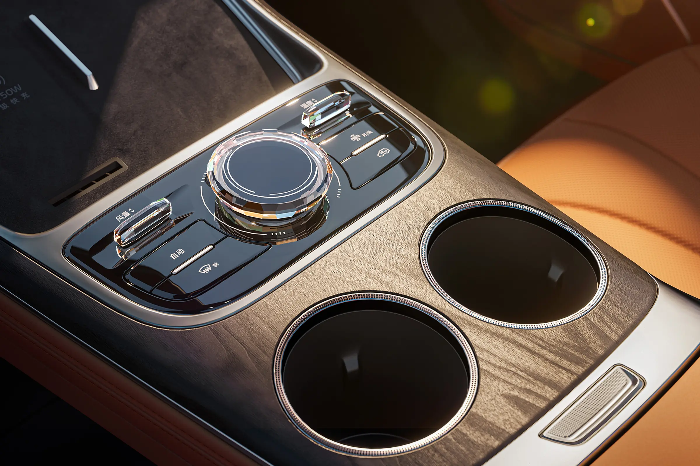 คอนโซลกลางตกแต่งด้วยลายไม้และวัสดุคริสตัล เพิ่มความประณีต ระบบอินโฟเทนเมนต์ใช้ Flyme Auto รองรับการเชื่อมต่ออัจฉริยะ พร้อมฟังก์ชันเด่น ได้แก่