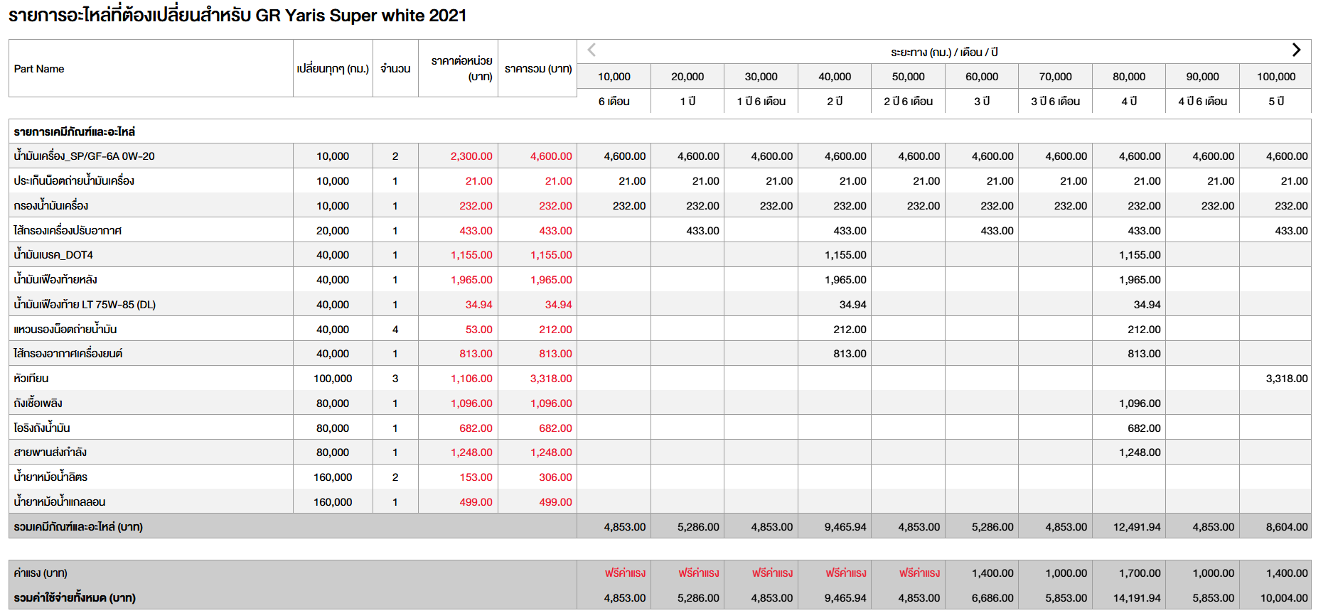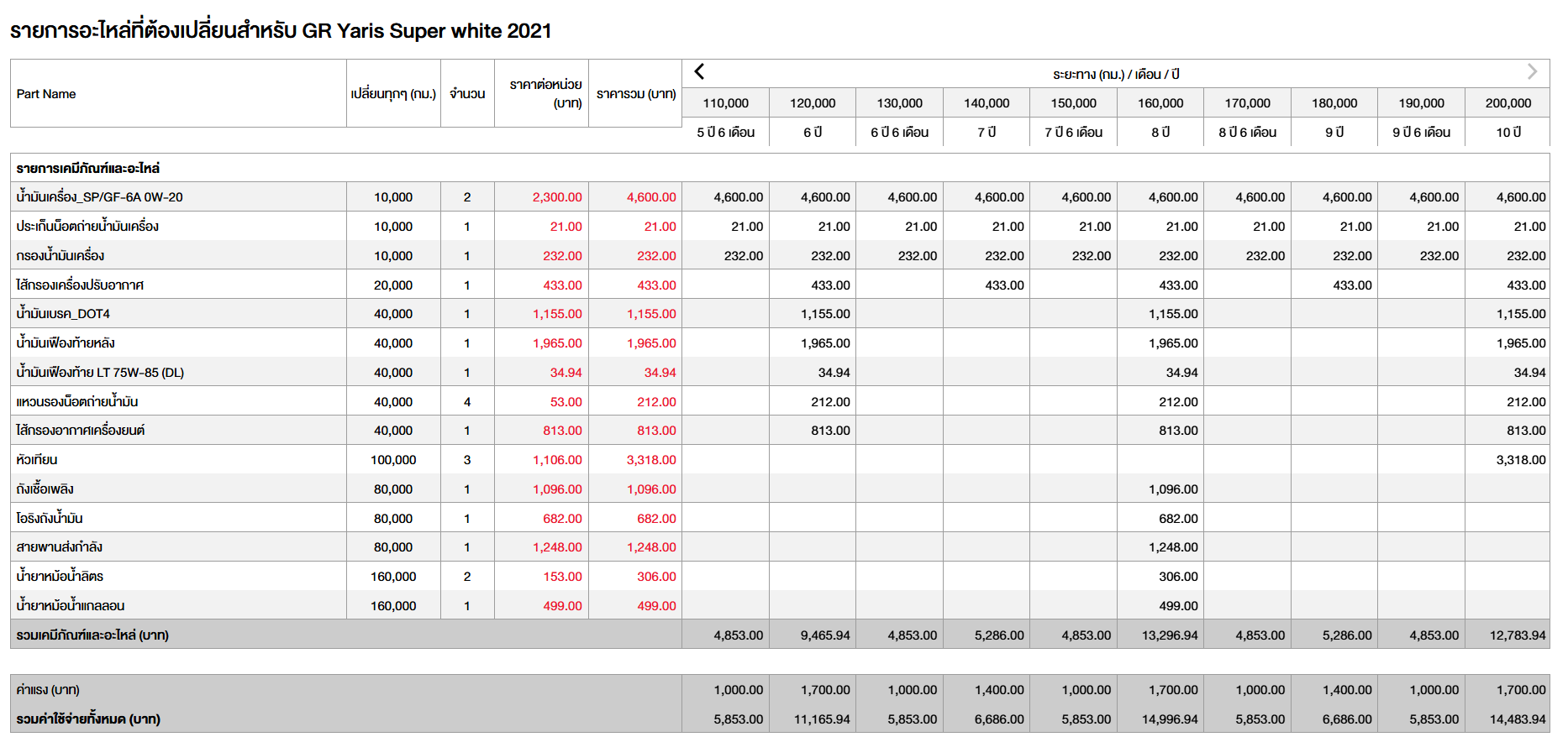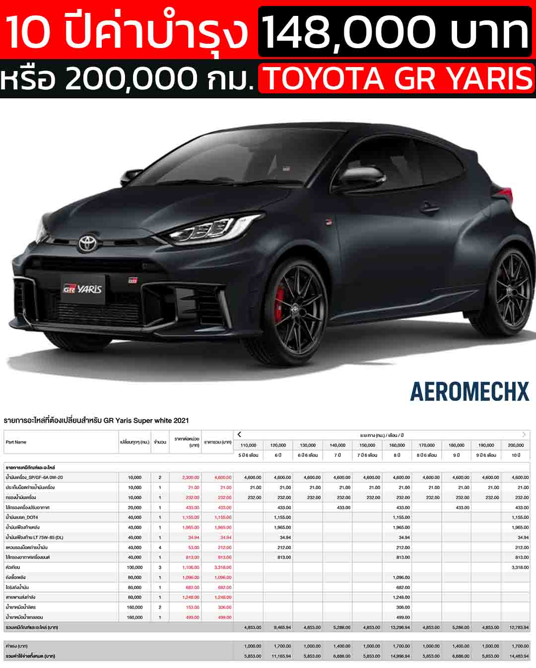 รวมค่าใช้จ่ายบำรุงรักษาทั้งหมดตลอด 10 ปี ของ GR Yaris Super White 2021 จะอยู่ที่ประมาณ 148,240 บาท