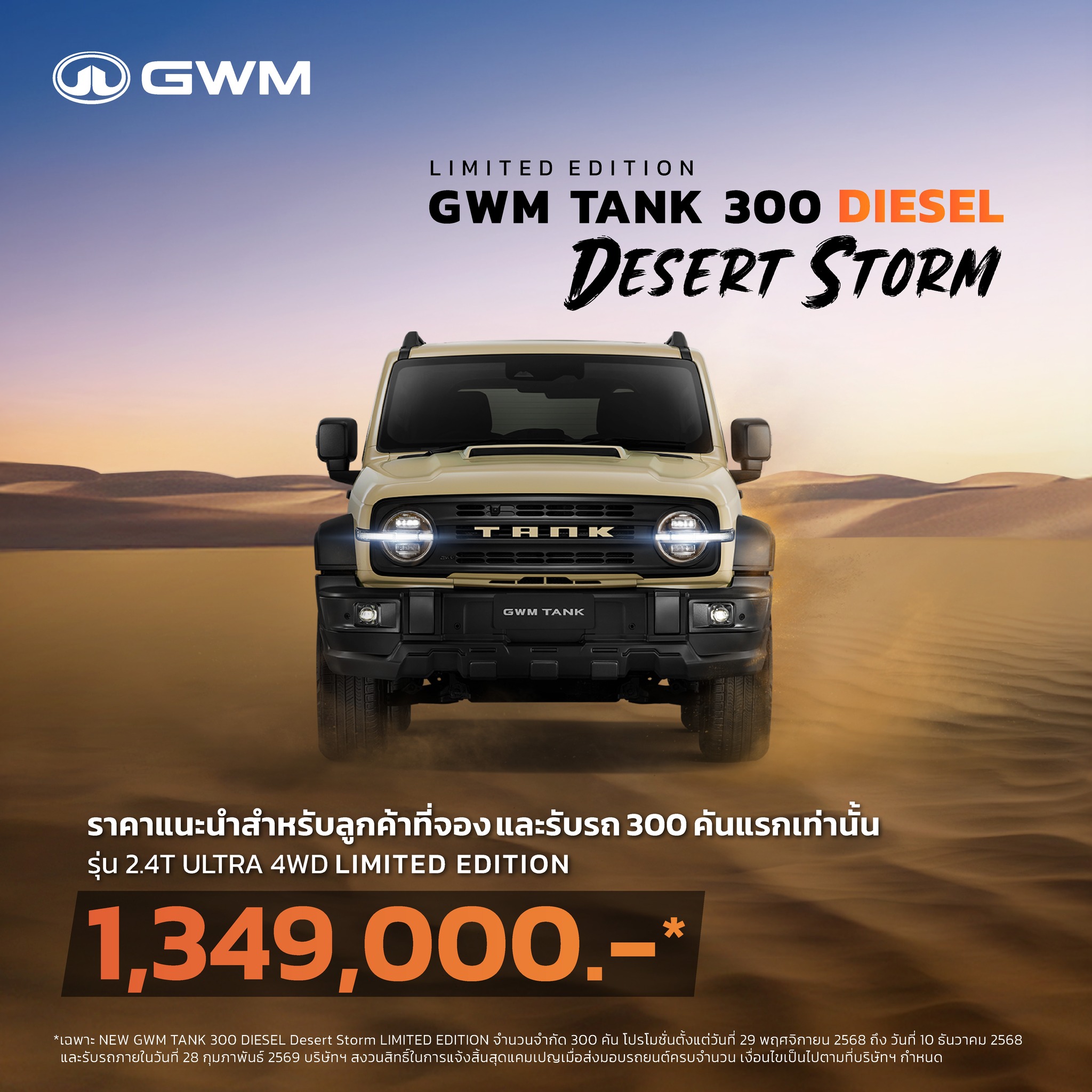 NEW GWM TANK 300 DIESEL “Desert Storm” Limited Edition รุ่นพิเศษใหม่ล่าสุดจาก GWM ที่มาพร้อมชุดตกแต่งพิเศษรอบคัน ออกแบบมาเพื่อตอบโจทย์ลูกค้าที่มองหารถออฟโรดสไตล์ดุดัน มีเอกลักษณ์ไม่ซ้ำใคร ทั้งภาพลักษณ์และฟีลลิ่งการขับขี่