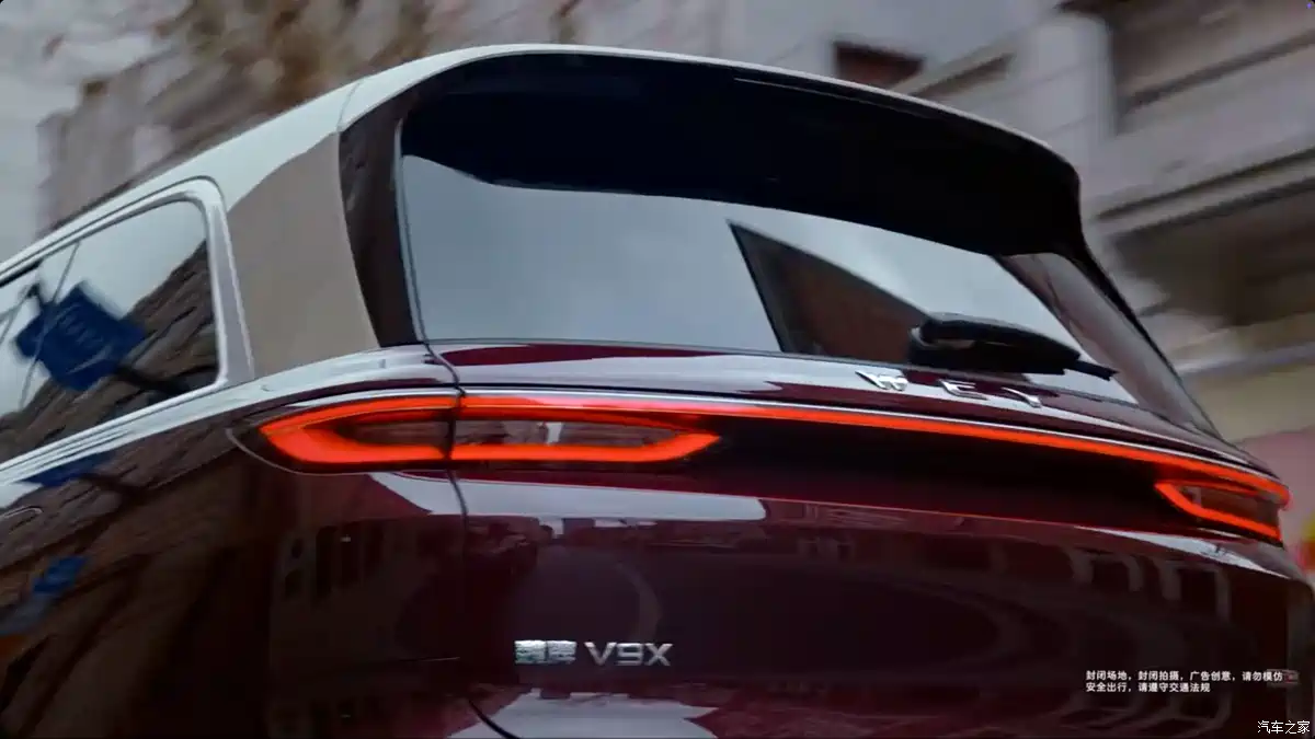 ด้านท้ายของ V9X ใช้ ไฟท้ายแบบพาดยาวเต็มแนว และเพิ่มเอกลักษณ์ด้วยกรอบไฟทรง วงรี ซ้าย–ขวา ส่วนบริเวณกึ่งกลางระบุว่ามีการรวม ไฟสีน้ำเงินของระบบช่วยขับ ไว้ด้วย ขณะเดียวกันกระจกหลังถูกออกแบบให้มี มุมมองค่อนข้างโปร่ง ซึ่งช่วยทั้งเรื่องทัศนวิสัยและความรู้สึกห้องโดยสารโปร่งโล่ง