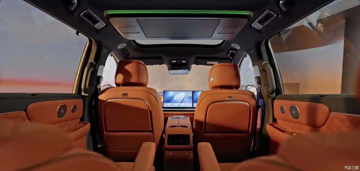 - แถวที่สอง: เบาะนั่งระดับ First Class ปรับเอนนอนได้ (Lay-flat mode) มาพร้อมจอความบันเทิงแบบพับเก็บได้บนเพดาน (Flip-down Screen) ที่ขอบจอมีไฟ Ambient Light เพิ่มความหรูหรา