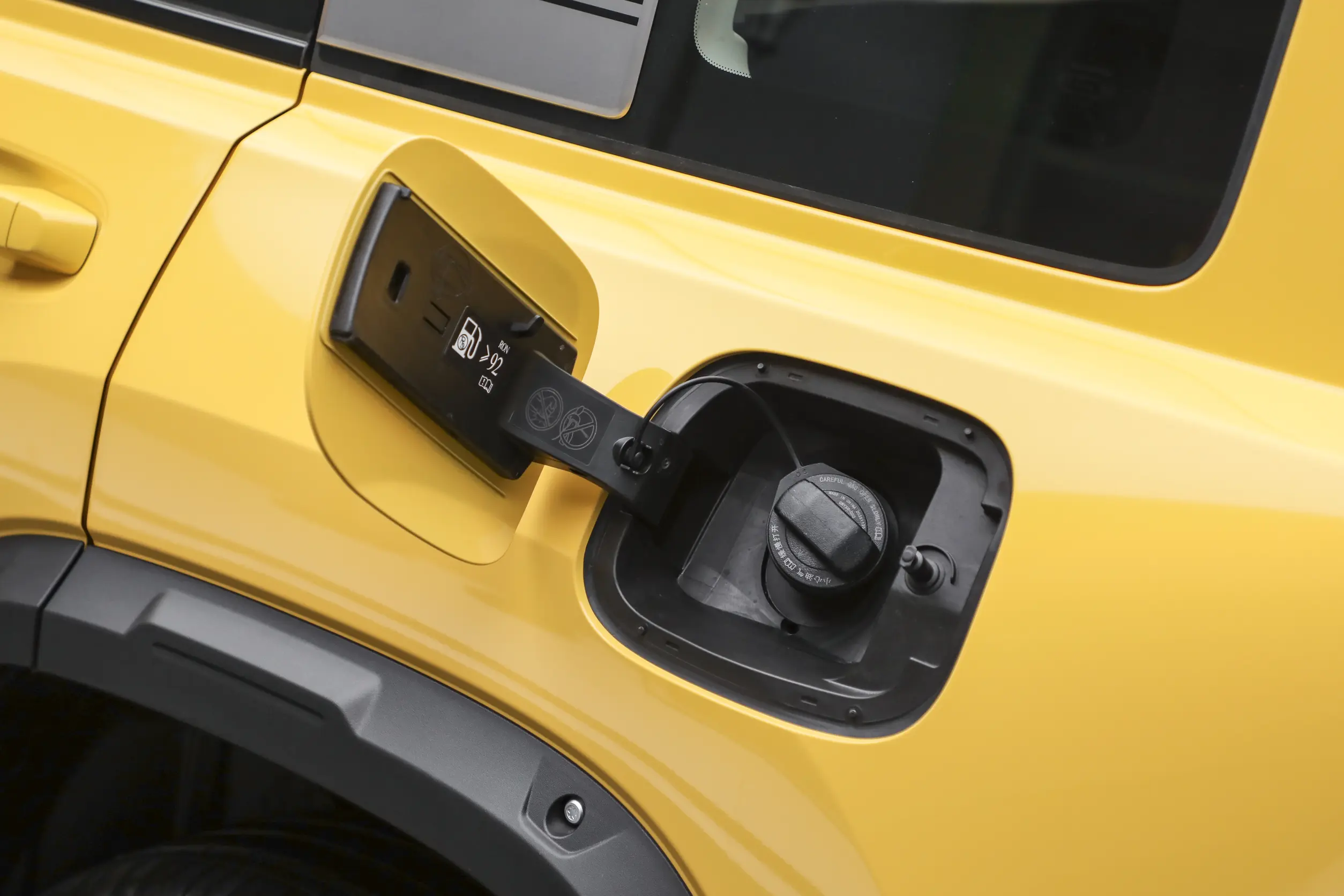 - ประตูท้ายและยางอะไหล่: ประตูท้ายเปิดแบบบานพับออกด้านข้าง (เปิดซ้าย) พร้อมติดตั้งยางอะไหล่แบบเต็มวง (Full-size) ไว้ที่ฝาท้ายตามสไตล์รถลุยตัวจริง